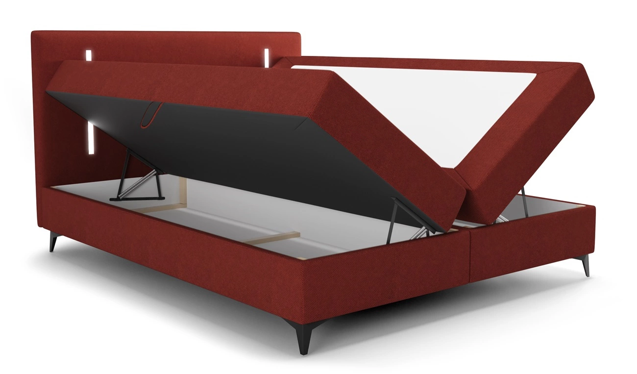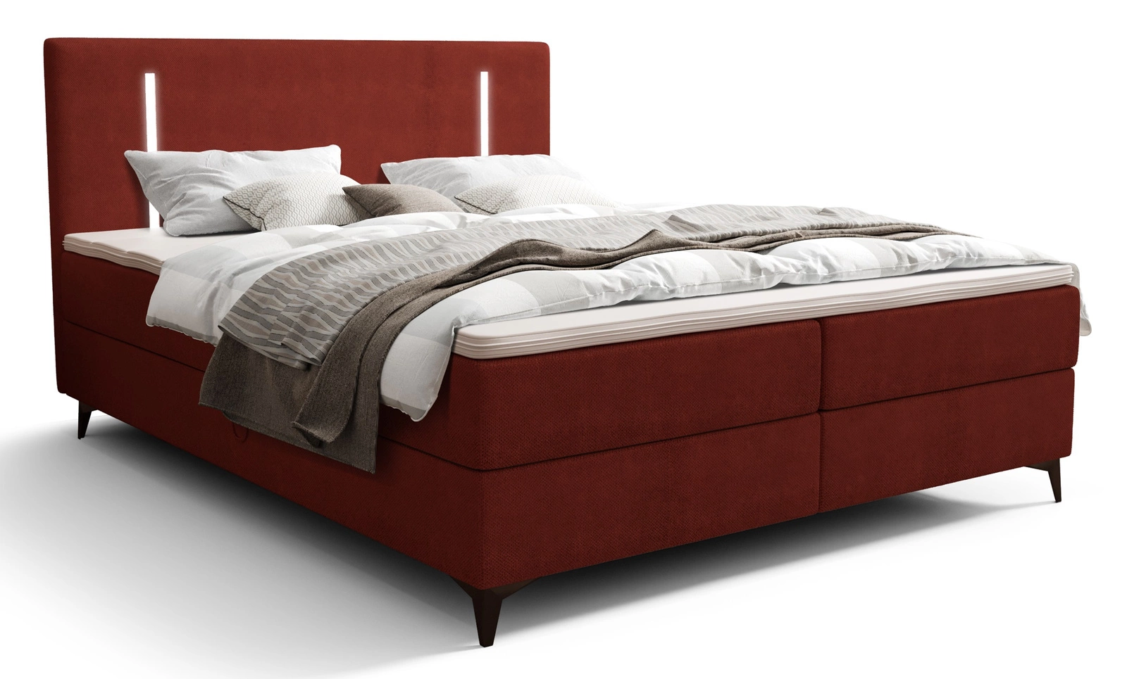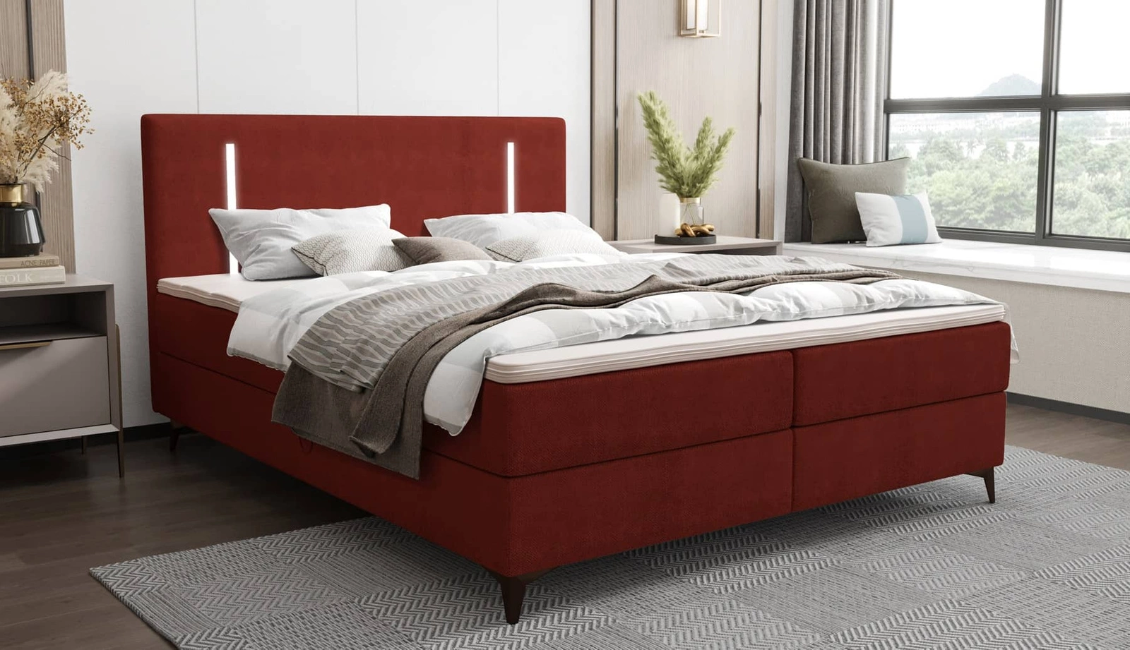 Boxspringbett Norco 180x200 dunkelrot stilvolles Bett mit Staukasten Beleuchtung im Kopfteil fügt eine einzigartige Note