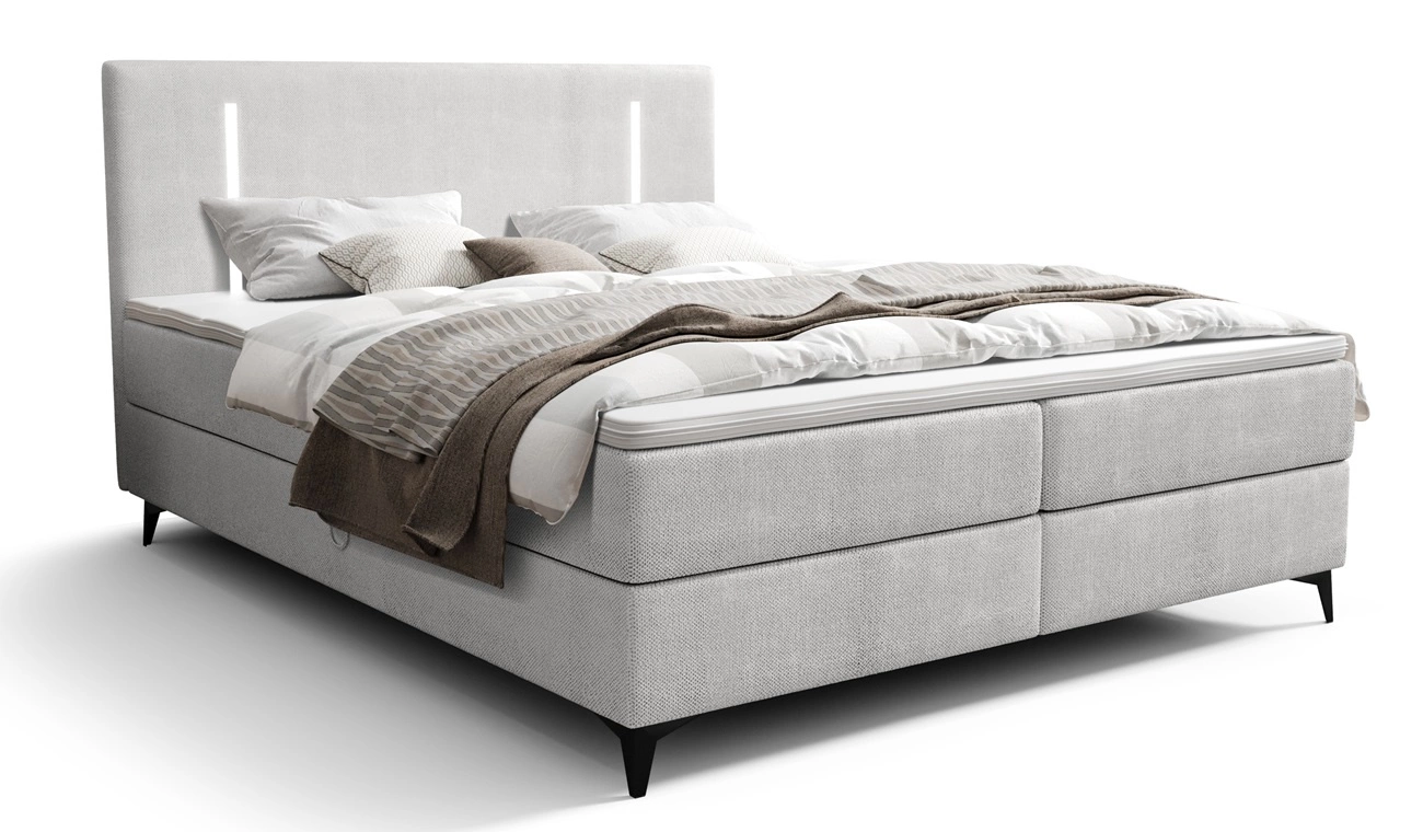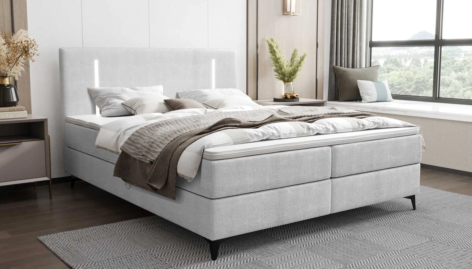 Boxspringbett Norco 180x200 grau Esche stilvolles Bett mit einem Speicher-Box Beleuchtung im Kopfteil fügt eine einzigartige Note