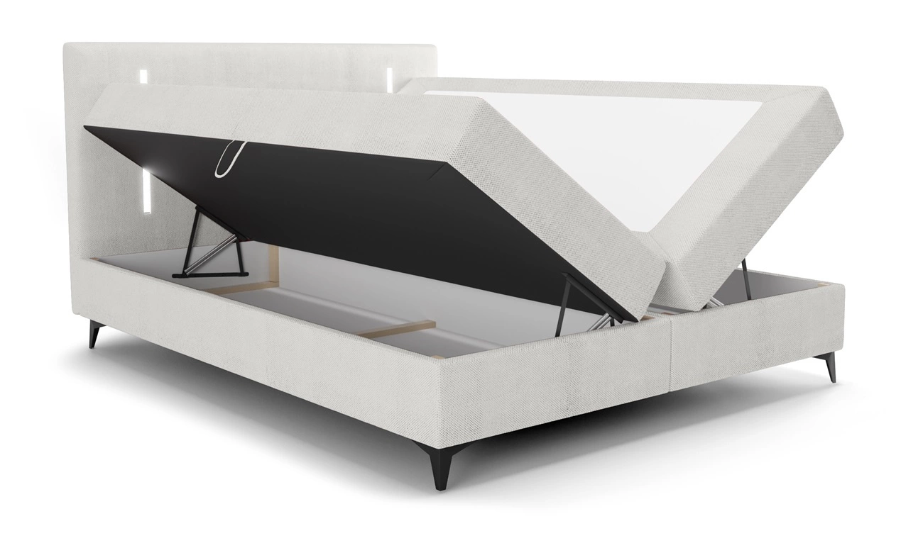 Für mehr Funktionalität das kontinentale Bett ist ausgestattet mit zwei Behälter, die eine bequeme Lagerung ermöglichen notwendiges Zubehör. Der Zugang zu den Bettkästen erfolgt durch Anheben der Matratze. Zuverlässige automatische Hebehilfen erleichtern die Arbeit.