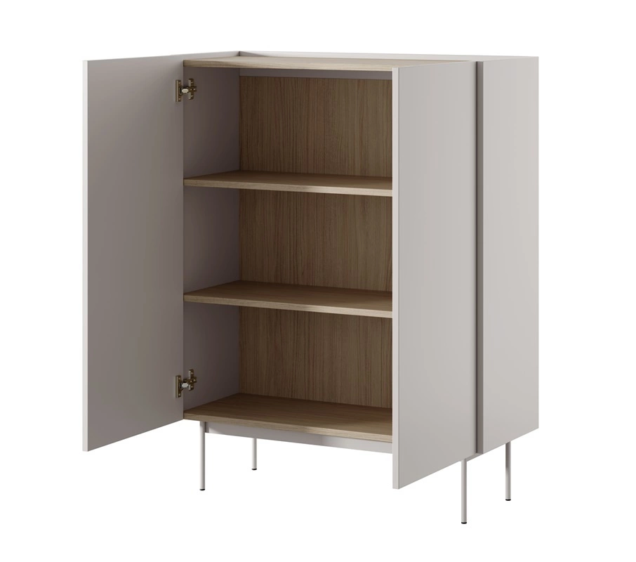 Die Möbel der Kollektion Vellore wird alle Liebhaber von raffinierten Arrangements begeistern. Die Möbel zeichnen sich durch ihre Schlichtheit und Eleganz aus und überraschen durch ihre breite Funktionalität. Subtile Farben fügt sich harmonisch ein in sanft gesenkte Oberteile im Schatten eiche linea den Möbeln ein einzigartiges Aussehen und Gefühl zu geben. Metallbeine im gleichen Farbton wie die Möbelfronten verleihen optische Leichtigkeit und bringen den luxuriösen Charakter der Solids perfekt zum Ausdruck. Grifflose Fronten die Komposition des Möbelsets kohärent und in einem minimalistischen Ton geschlossen gestalten.