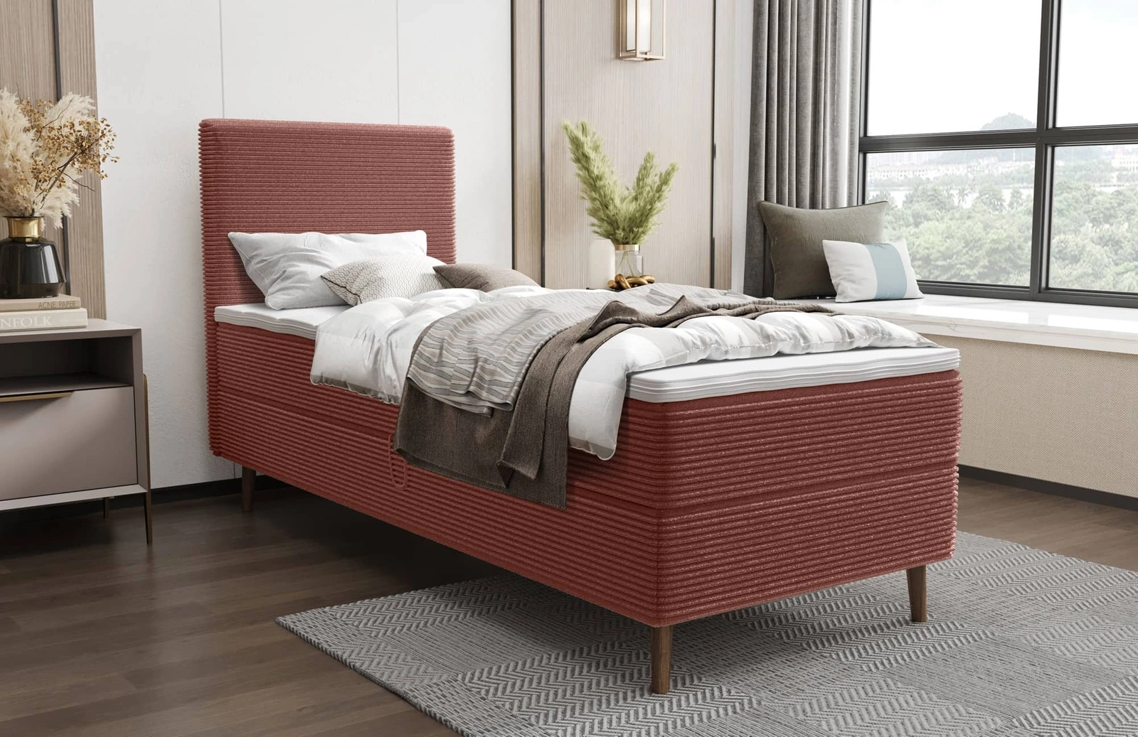 Das kontinentale Bett Totti ist eine Kombination aus Funktionalität und modernem Design, die jedes Schlafzimmer mit Eleganz und Stil bereichert. Hohe Kopfstütze aus weichem Kordstoff schmückt nicht nur den Innenraum, sondern dient auch als bequeme Unterlage beim Lesen eines Buches, Fernsehen oder Arbeiten am Laptop. Die Bettstruktur wird von schlanken, holz beine, die den skandinavischen Charakter von Bett und Matratze unterstreichen und die Stabilität des Möbels garantieren. Die stilvollen kontinentalen Betten aus der Totti-Kollektion schaffen einen äußerst komfortablen Raum für die tägliche Entspannung.