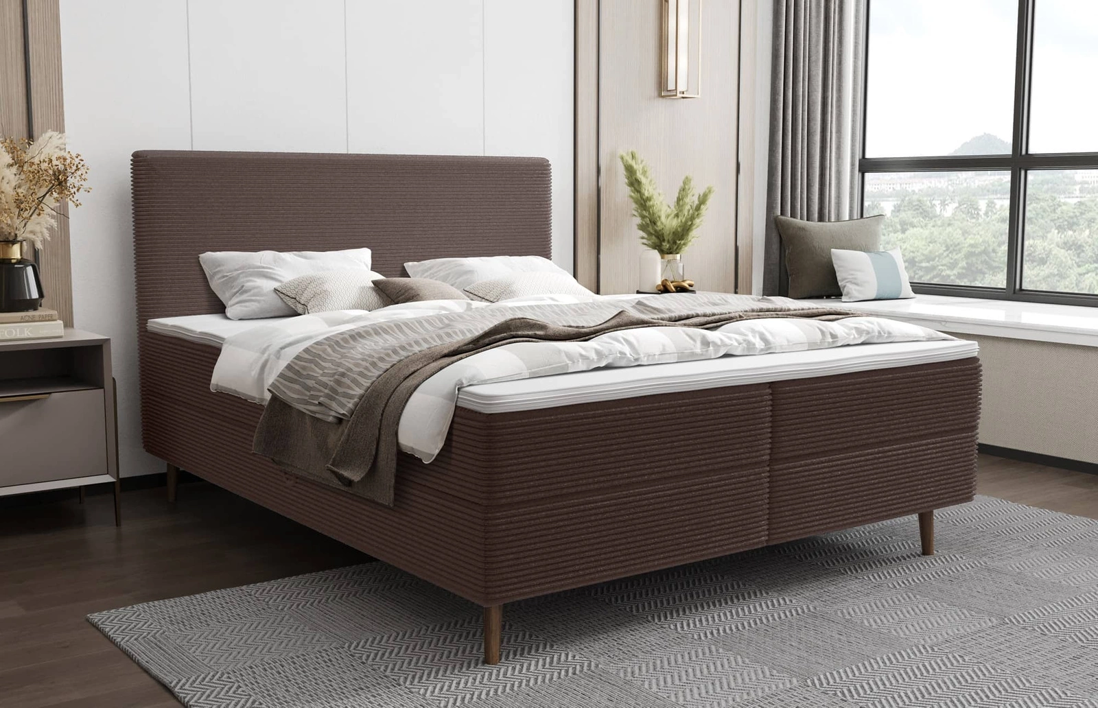 Das kontinentale Bett Totti ist eine Kombination aus Funktionalität und modernem Design, die jedes Schlafzimmer mit Eleganz und Stil bereichert. Hohe Kopfstütze aus weichem Kordstoff schmückt nicht nur den Innenraum, sondern dient auch als bequeme Unterlage beim Lesen eines Buches, Fernsehen oder Arbeiten am Laptop. Das Design des Schlafzimmerbettes wird durch schlanke, holz beine, die den skandinavischen Charakter von Bett und Matratze unterstreichen und die Stabilität des Möbels garantieren. Die stilvollen kontinentalen Betten aus der Totti-Kollektion schaffen einen äußerst komfortablen Raum für die tägliche Entspannung.