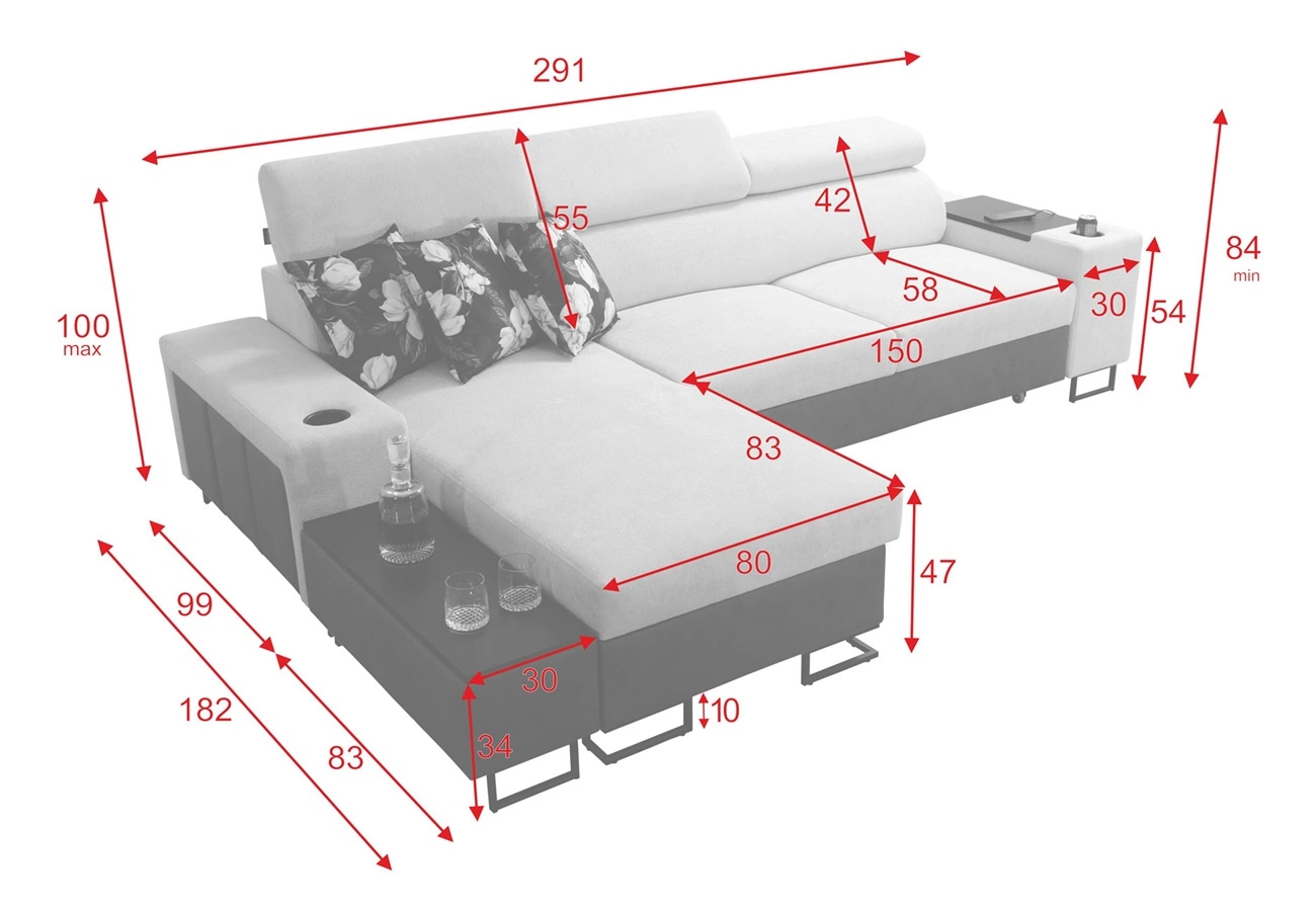 Die Abmessungen der Möbel ermöglichen füllung eines geräumigen Wohnzimmers oder Sitzungssaals. Breite der Ecke 291 cm, maximale Höhe 100 cm und Tiefe 182 cm. Die Liegefläche der Eckeinheit beträgt 127x226 cm. Die Sitzhöhe des Möbels beträgt 47 cm und die maximale Höhe der Rückenlehne beträgt 55 cm. Gewellte Federn und T30-Polyurethanschaum ist das Material, aus dem der Sitz der Ecke hergestellt ist. Feste Rückenlehne mit verstellbaren Kopfstützen ermöglicht eine einfache anpassung sie können die Neigung der Kopfstützen nach Ihren Wünschen einstellen und so für eine bequeme Erholung nach einem langen Tag sorgen, die Sie, Ihre Lieben und auch Ihre Gäste, die auf diesem einzigartigen Ecksofa Platz nehmen, zu schätzen wissen werden.