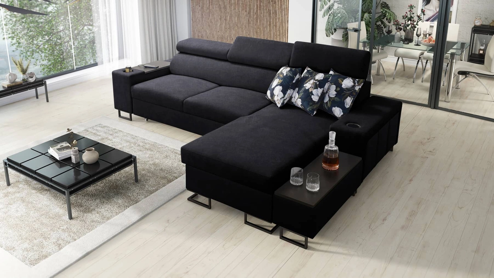 Ecksofa Flavio in Schwarz mit verstellbaren Kopfstützen ist ein elegantes Möbelstück, das sich in jede Einrichtung einfügt.
