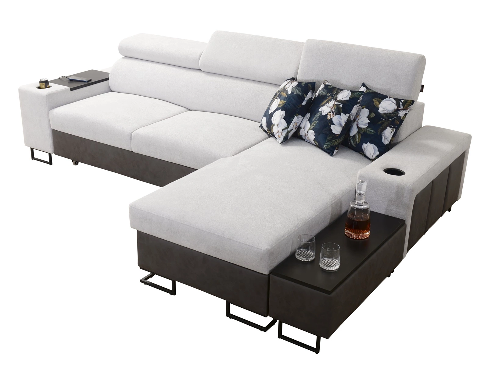 Eckeinheit mit Schlaffunktion Flavio verbindet Funktionalität mit einer äußerst eleganten Form. Kie Eckstruktur ist mit einem strukturgewebe Freya 210.20 und öko-Leder Tauro 8207. Möbel zeichnet sich durch eine Vielzahl von Ergänzungen aus, die die Ecke noch funktionaler machen und hohe Verarbeitungsqualität. Der stilvolle Körper wurde durch dekorative, einfache nähte verzierung der Seiten der Ecke. Das Vorhandensein von gemusterten Kissen sorgt für noch mehr Komfort und Bequemlichkeit bei diesem hochmodernen Ecksofa. Mobile Erweiterung mit Regal ist ein funktionelles Accessoire, das erfolgreich als zusätzlicher Couchtisch für das Wohnzimmer verwendet werden kann. Modern design der Ecke funktioniert auch in das anspruchsvollste Interieur.