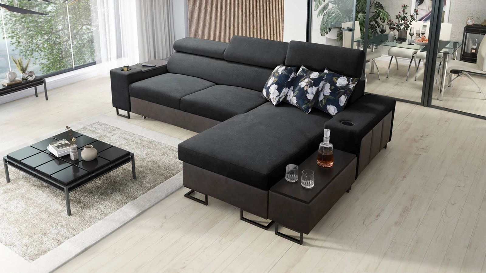 Ecksofa Flavio in Graphit mit verstellbaren Kopfstützen ist ein elegantes Möbelstück, das zu jeder Einrichtung passt.
