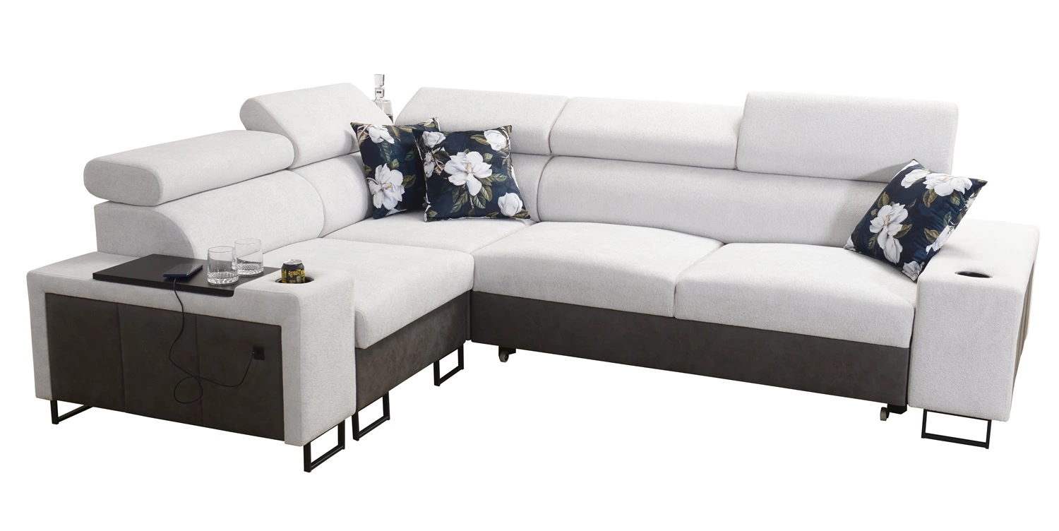 Die Abmessungen der Möbel ermöglichen füllung eines geräumigen Wohnzimmers oder Sitzungssaals. Breite der Ecke 282 cm, maximale Höhe 100 cm und Tiefe 205 cm. Die Liegefläche der Eckeinheit beträgt 127x210 cm. Die Sitzhöhe des Möbels beträgt 47 cm und die maximale Höhe der Rückenlehne beträgt 55 cm. Gewellte Federn und T30-Polyurethanschaum ist das Material, aus dem der Sitz der Ecke hergestellt ist. Feste Rückenlehne mit verstellbaren Kopfstützen ermöglicht eine einfache anpassung sie können die Neigung der Kopfstützen nach Ihren Wünschen einstellen und so für eine bequeme Erholung nach einem langen Tag sorgen, die Sie, Ihre Lieben und auch Ihre Gäste, die auf diesem einzigartigen Ecksofa Platz nehmen, zu schätzen wissen werden.