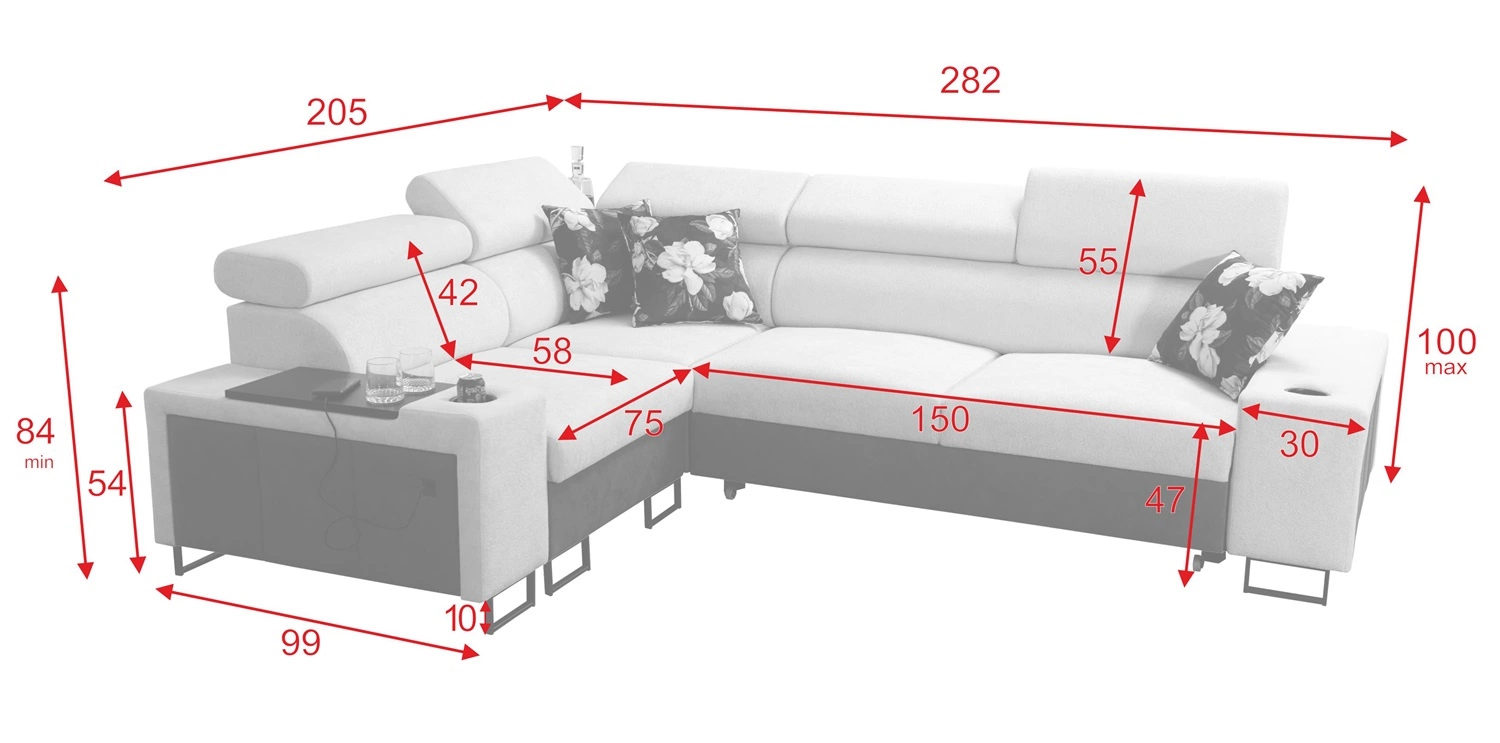 Die Abmessungen der Möbel ermöglichen füllung eines geräumigen Wohnzimmers oder Sitzungssaals. Breite der Ecke 282 cm, maximale Höhe 100 cm und Tiefe 205 cm. Die Liegefläche der Eckeinheit beträgt 127x210 cm. Die Sitzhöhe des Möbels beträgt 47 cm und die maximale Höhe der Rückenlehne beträgt 55 cm. Gewellte Federn und T30-Polyurethanschaum ist das Material, aus dem der Sitz der Ecke hergestellt ist. Feste Rückenlehne mit verstellbaren Kopfstützen ermöglicht eine einfache anpassung sie können die Neigung der Kopfstützen nach Ihren Wünschen einstellen und so für eine bequeme Erholung nach einem langen Tag sorgen, die Sie, Ihre Lieben und auch Ihre Gäste, die auf diesem einzigartigen Ecksofa Platz nehmen, zu schätzen wissen werden.