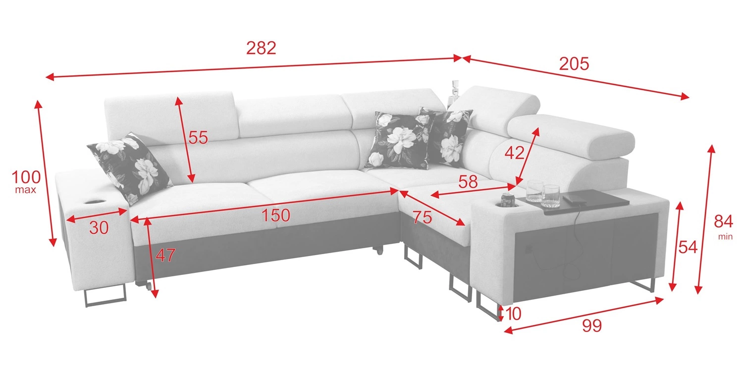 Die Abmessungen der Möbel ermöglichen füllung eines geräumigen Wohnzimmers oder Sitzungssaals. Breite der Ecke 282 cm, maximale Höhe 100 cm und Tiefe 205 cm. Die Liegefläche der Eckeinheit beträgt 127x210 cm. Die Sitzhöhe des Möbels beträgt 47 cm und die maximale Höhe der Rückenlehne beträgt 55 cm. Gewellte Federn und T30-Polyurethanschaum ist das Material, aus dem der Sitz der Ecke hergestellt ist. Feste Rückenlehne mit verstellbaren Kopfstützen ermöglicht eine einfache anpassung sie können die Neigung der Kopfstützen nach Ihren Wünschen einstellen und so für eine bequeme Erholung nach einem langen Tag sorgen, die Sie, Ihre Lieben und auch Ihre Gäste, die auf diesem einzigartigen Ecksofa Platz nehmen, zu schätzen wissen werden.