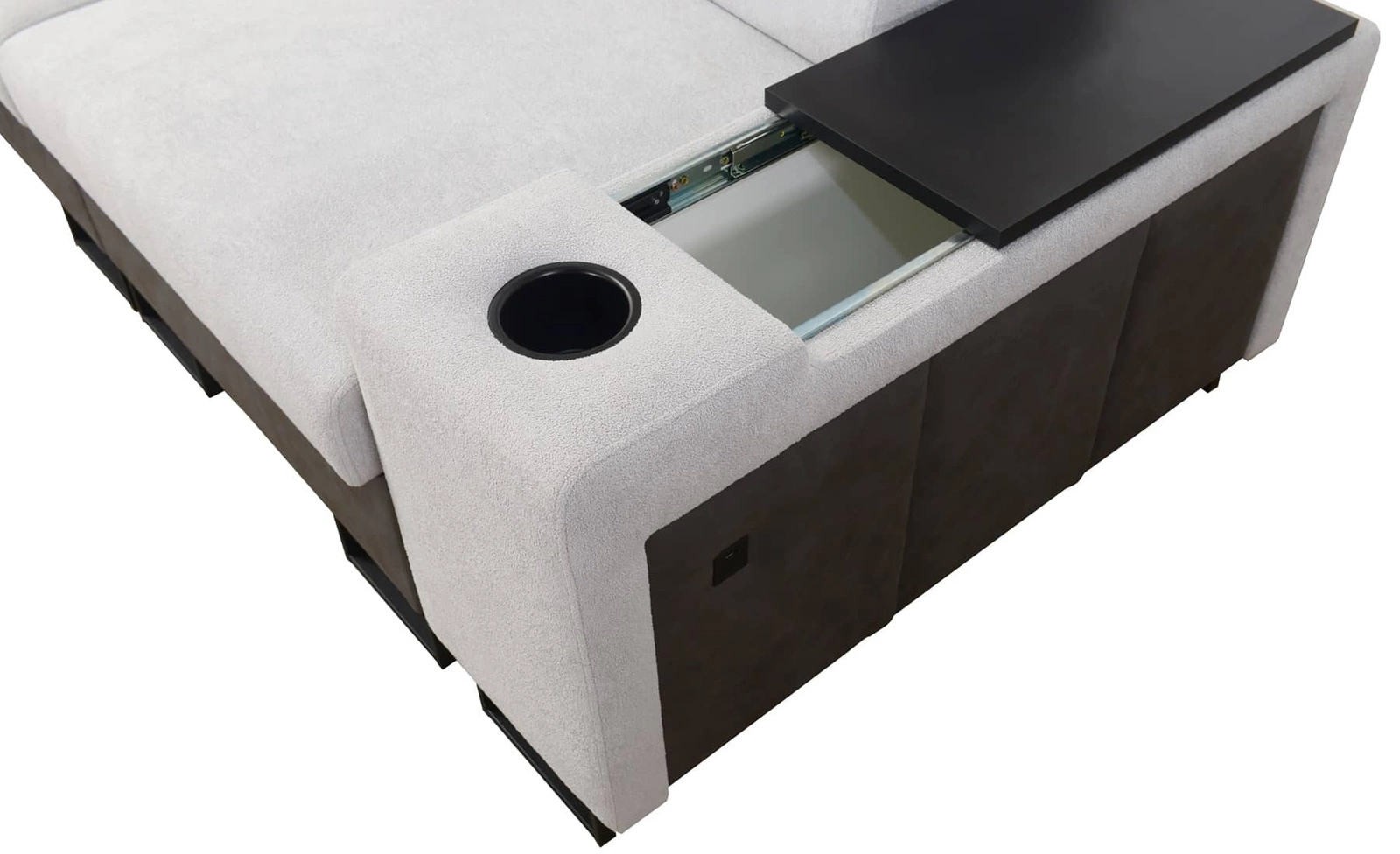 Eine USB-Ladebuchse, ein kleines Regal in der Ecke und Getränkehalter sind zusätzliche Ausstattungsmerkmale, die alle Nutzer zu schätzen wissen werden.