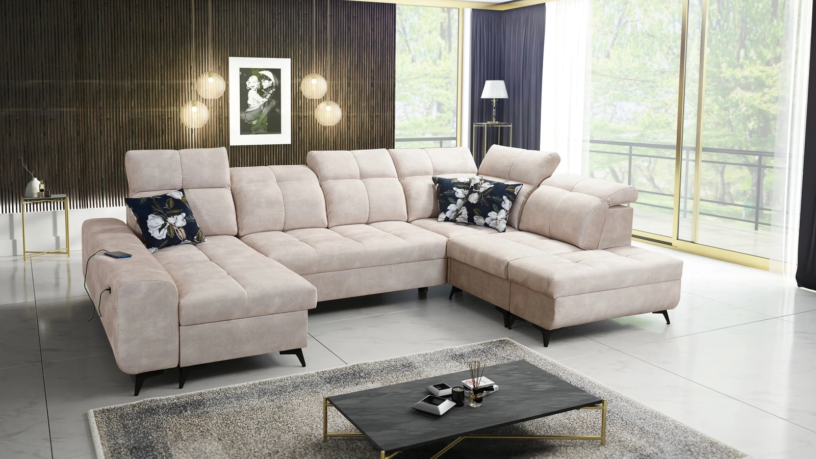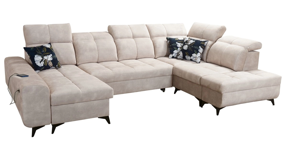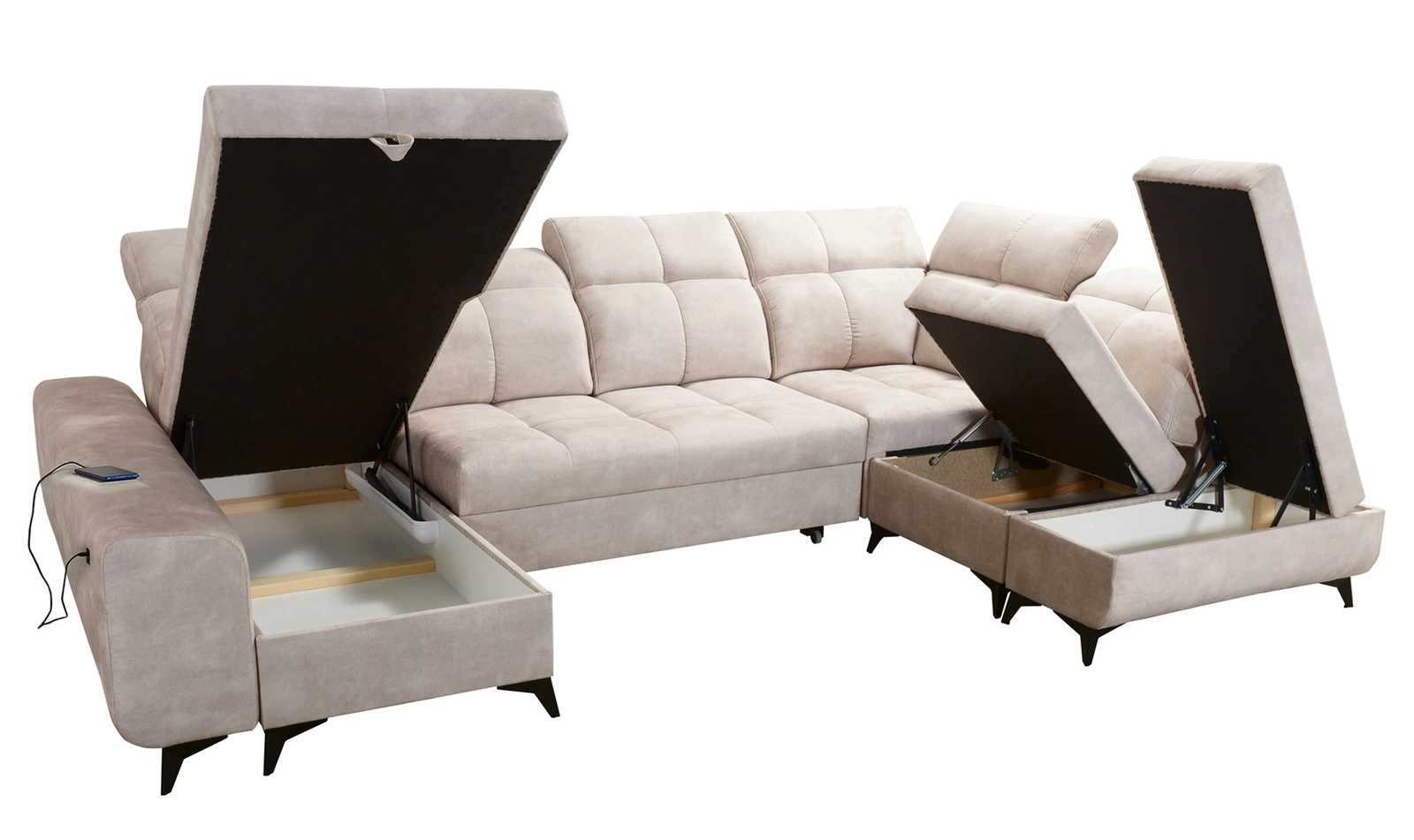 Bis zu sechs verstellbare Kopfstützen, drei Bettkästen und eine USB-Ladesteckdose an der Seite des Eckmöbels sind die Extras dieses Möbels, die alle Nutzer schätzen werden.