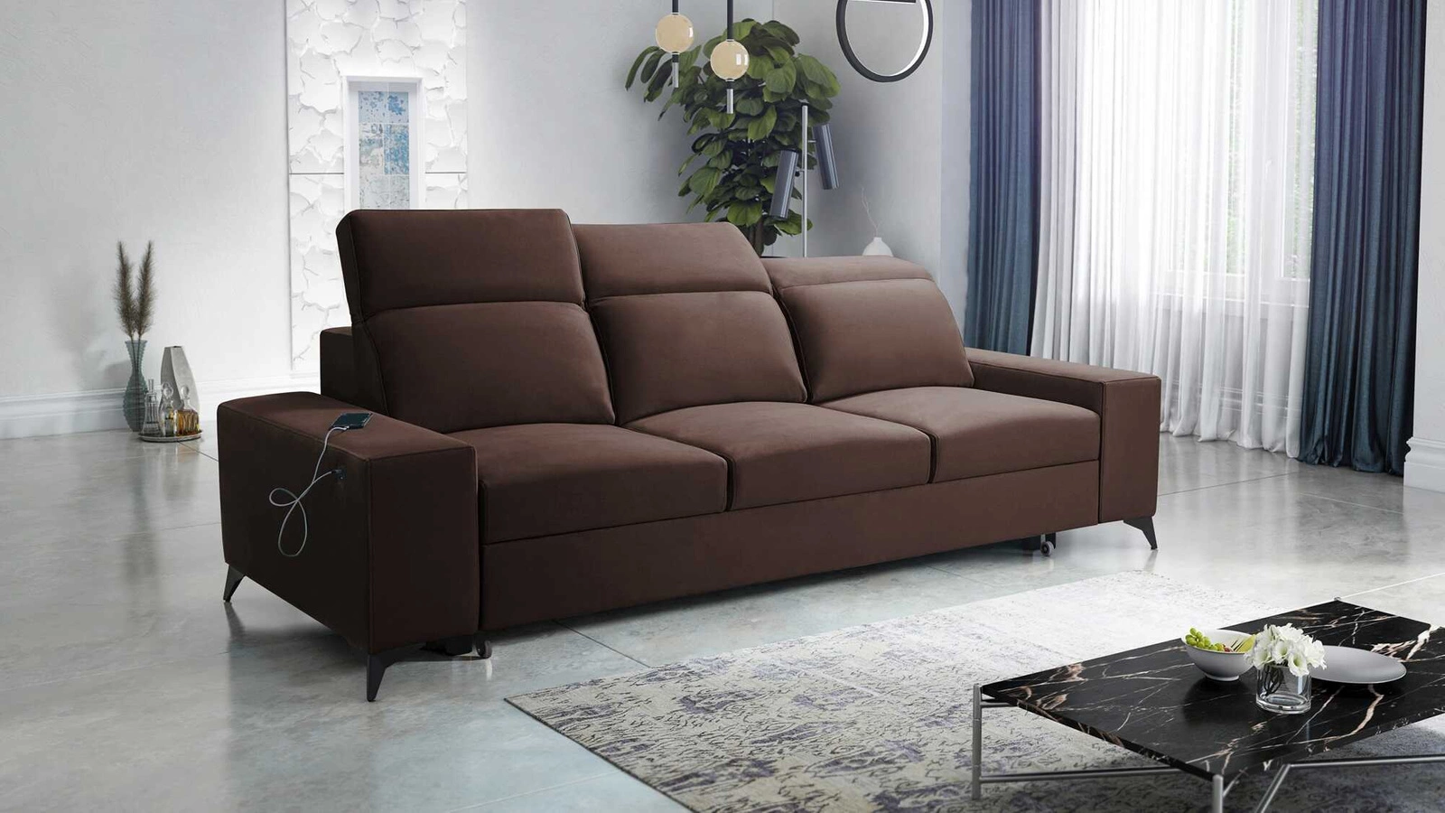 Kelly Sofa mit Schlaffunktion braun stilvolles Wohnzimmersofa mit einfachem Design verstellbare Kopfstützen Veloursstoff