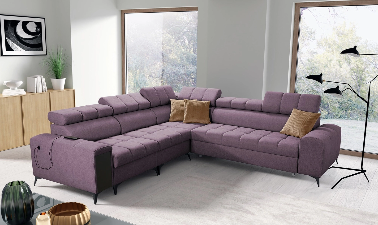 Bolmso Ecksofa III in Lila mit verstellbaren Kopfstützen ist ein reizvolles Möbelstück mit der Garantie für höchsten Komfort und Funktionalität.