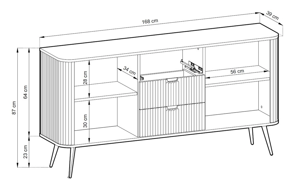 Geriffelte Fronten sind hergestellt aus mDF. Gehäuse aus hochwertige 18 mm dicke laminierte Platte, die resistent gegen äußere Einflüsse wie Druckstellen, Stöße und unglückliche Kratzer ist. Beine aus Metall in kontrastierender schwarzer Farbe optische Leichtigkeit bei gleichzeitiger Funktionalität.