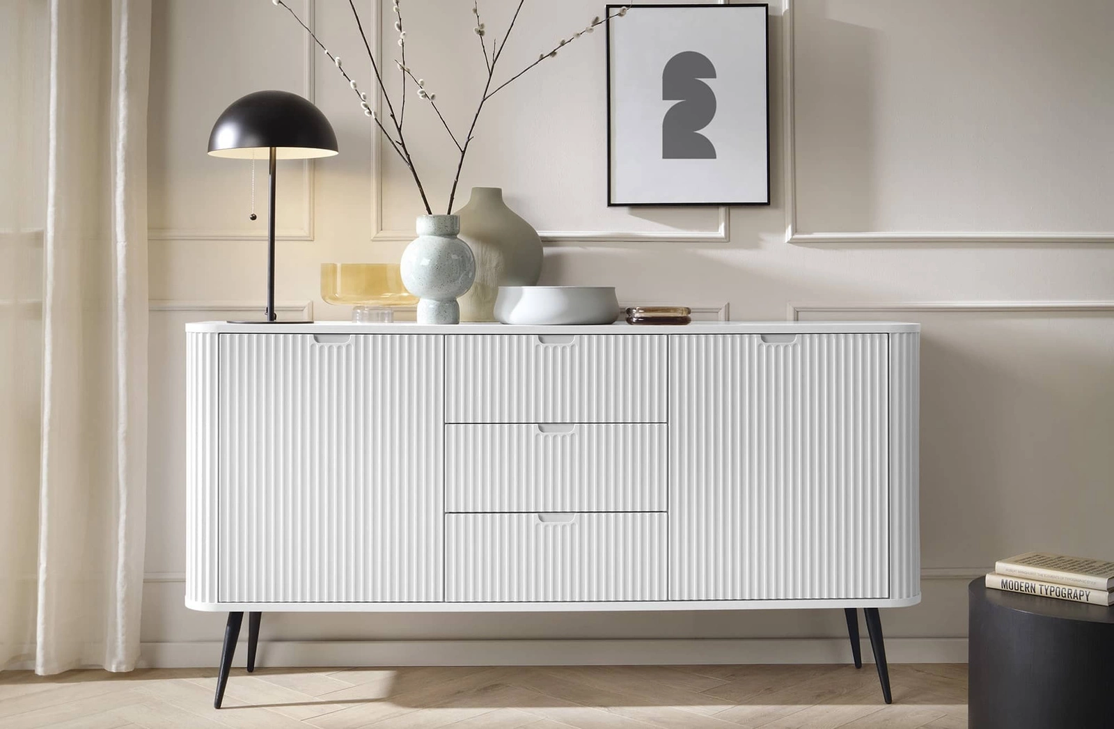 Zoya 168 cm Schubladenkommode weiß elegantes Design ovale Form auf Metallbeinen geschmackvolle geriffelte Front gesetzt