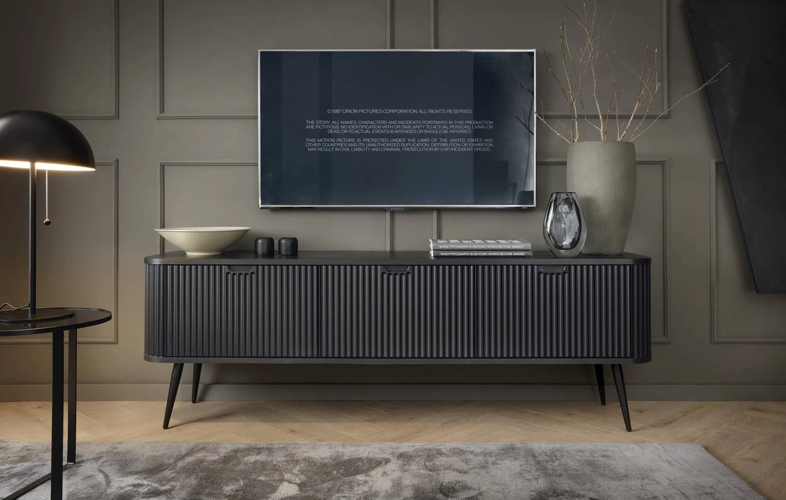 Der Zoya RTV-Schrank in Schwarz ist ein modernes Möbelstück, das durch seine Form und Ästhetik überrascht.