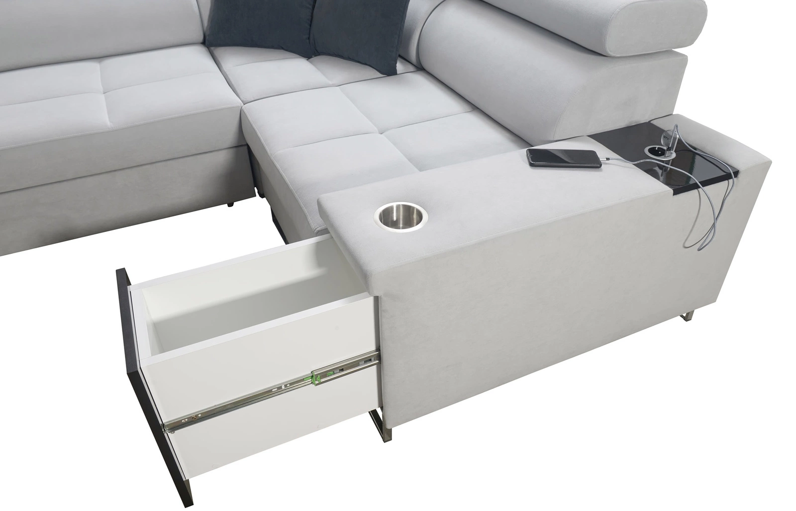 Weitere Merkmale dieses Möbelstücks, die von allen Nutzern geschätzt werden, sind ein Bettzeugbehälter, eine Schlaffunktion, Becherhalter in den Seiten, eine USB-Ladebuchse und eine Steckdose in der Seite des Eckmöbels sowie eine Schublade mit Vollauszug in der Seite des Möbels.