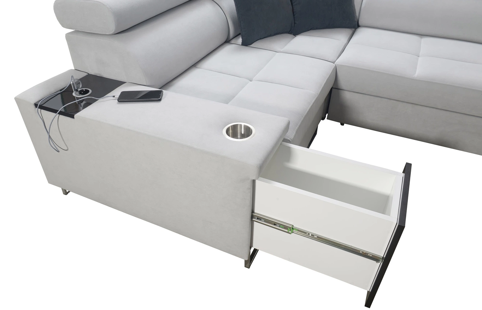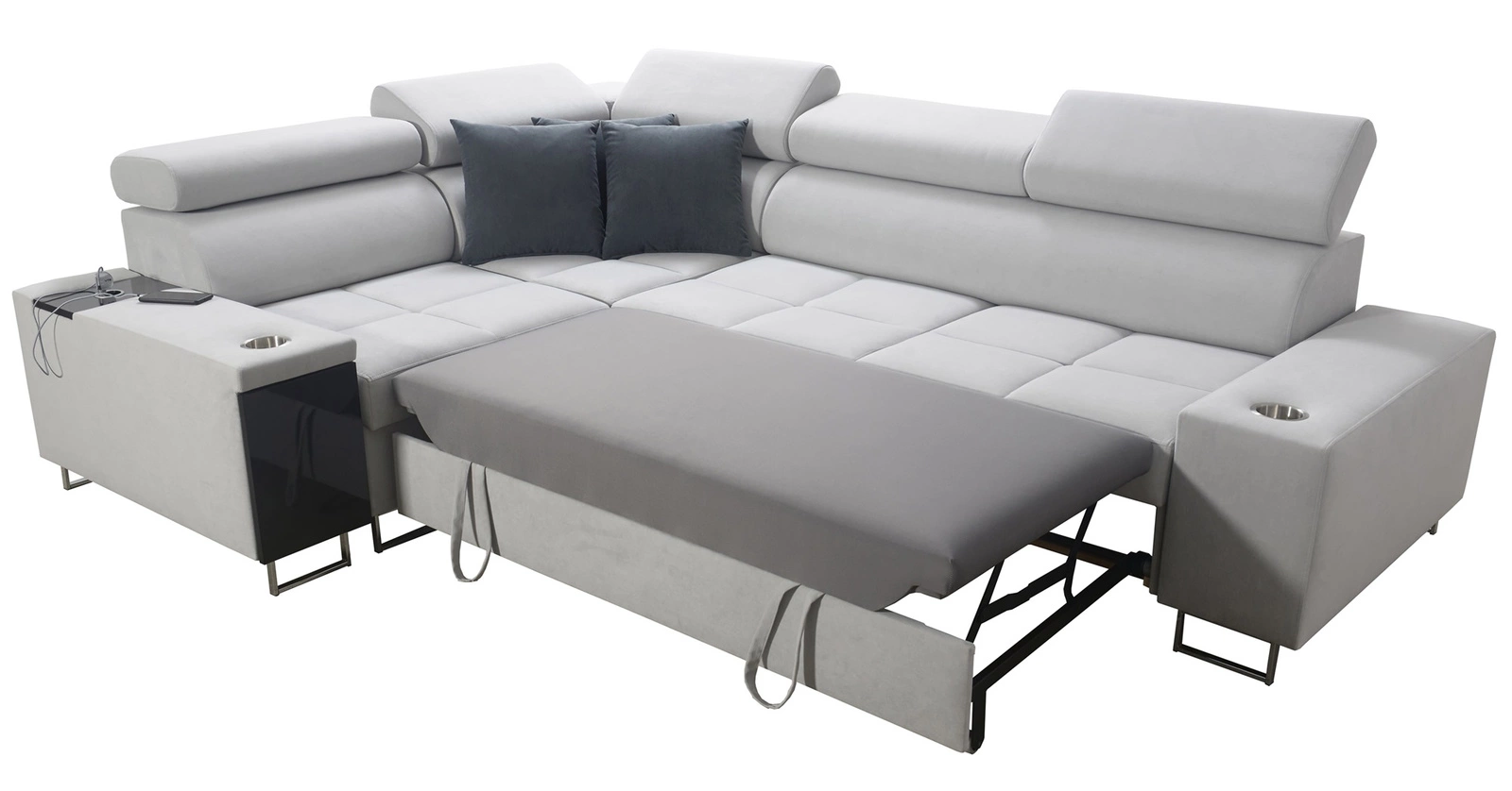 Weitere Merkmale dieses Möbelstücks, die von allen Nutzern geschätzt werden, sind ein Bettzeugbehälter, eine Schlaffunktion, Becherhalter in den Seiten, eine USB-Ladebuchse und eine Steckdose in der Seite des Eckmöbels sowie eine Schublade mit Vollauszug in der Seite des Möbels.
