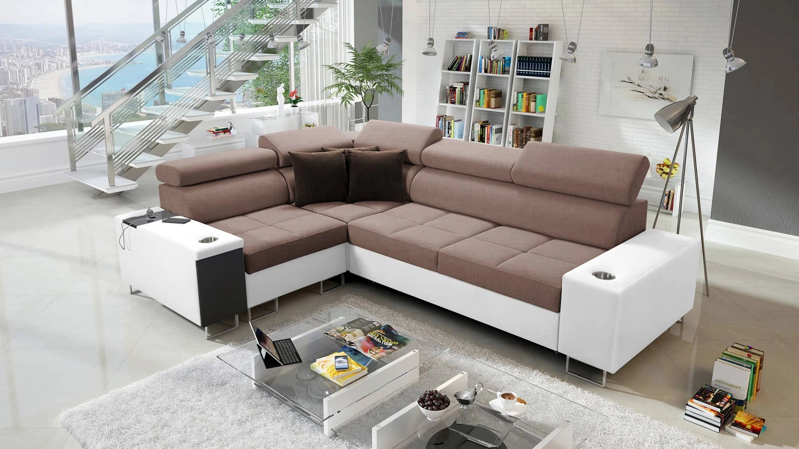 Ecksofa Dafni II in Hellbraun/Weiß mit verstellbaren Kopfstützen ist ein Rezept für ein modernes Interieur in Ihrem Zuhause!