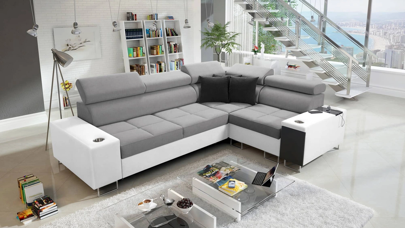 Ecksofa Dafni II in Grau/Weiß mit verstellbaren Kopfstützen ist ein Rezept für ein modernes Interieur in Ihrem Zuhause!