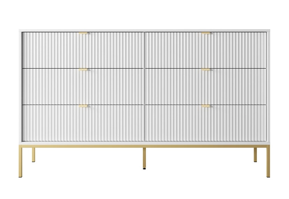 Die Kommode ist gefertigt aus 6 Schubladen. Die Kommode garantiert komfortable und problemlose Nutzung und Langlebigkeit des gesamten Möbelstücks für viele Jahre der Nutzung. Charakteristische geriffelte Fronten sind perfekt für kühne Arrangements und machen die Lovro Kommode zu einer perfekten Wohnkommode mit luxuriöser oberfläche, kommoden für das Wohnzimmer oder Kommoden für das Schlafzimmer in einem modernen Stil. Eine Kommode kann auch erfolgreich als Büromöbel eingesetzt werden.