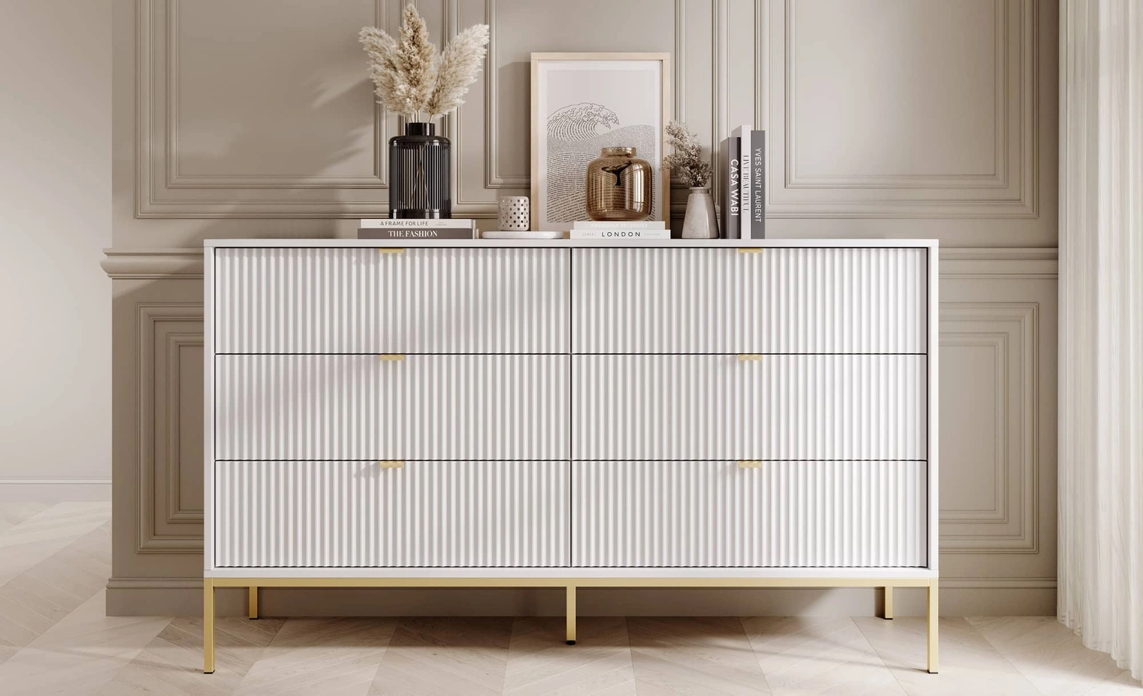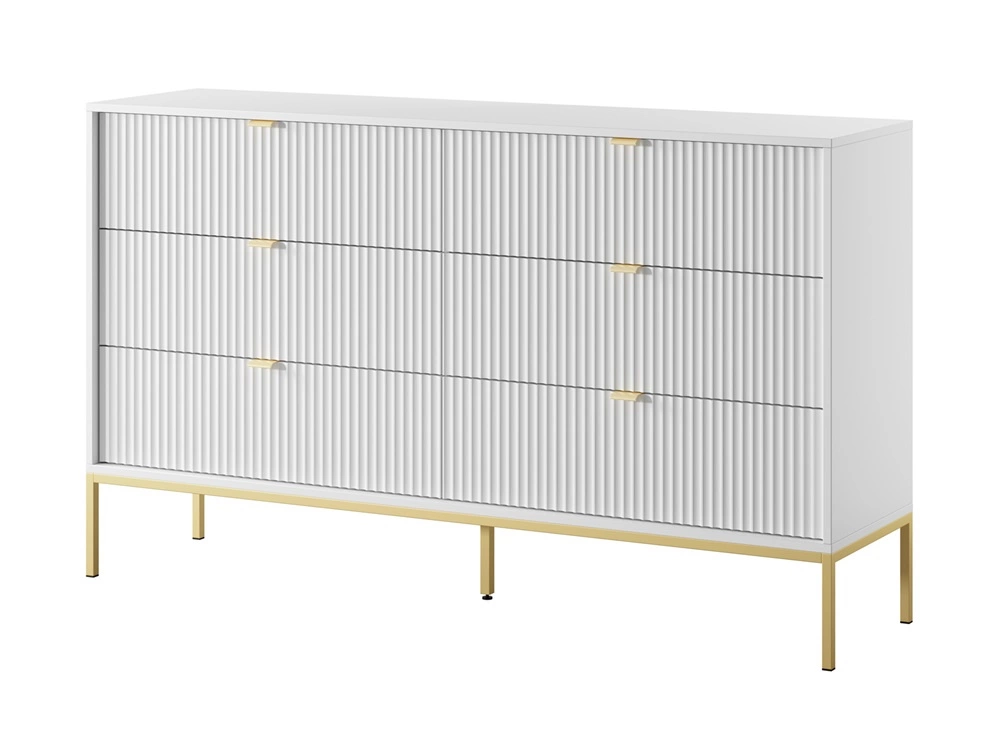 Kommode mit Schubladen Lovro 154 cm weiß modernes Design wird Liebhaber von ausdrucksstarken Interieurs geriffelte Fronten Gold-Accessoires begeistern