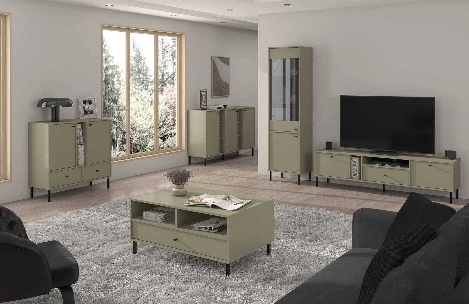 Couchtisch mit Schublade Kioto ist ein reizvolles Möbelstück mit einem besonderen und einzigartigen Charakter. Ungewöhnliche Kombination aus eukalyptusgrün mit schwarzen Griffen macht den gesamten Look dezent und sehr stilvoll. Zurückgezogen bezogen auf die Schubladenfront des Schrankes verleiht Finesse und Eleganz und ist gleichzeitig eine auffällige Dekoration. Der Couchtisch aus der Kyoto-Kollektion ist ein einzigartiges Projekt, das sich durch seine Form und sein Design perfekt in die regelungen in japanischer und moderner Stil.