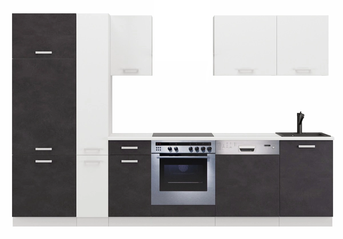 Der Korpus und die Fronten des Küchenmöbelsets sind aus hochwertiger laminierter Platte 16 mm dick, mit ABS-Furnier umrandet. Die Fronten weisen eine hohe Widerstandsfähigkeit gegen Feuchtigkeit und Unfallschäden auf. Die oberen Küchenschränke sind mit einem System von zum Einhängen in die universelle Montageschiene. Küchenschrank für Einbaukühlschrank, Küchenhängeschränke, Küchenhochschrank mit Schublade und Küchenschrank unter der Spüle haben eine Universaltür, die rechts oder links montiert werden können. CARGO Küchenschrank ist mit einem Metallkorb ausgestattet. Die Küchenschränke aus dem Toni-Set sind sicher verpackt und werden mit einem kompletten Beschlagsatz (Schrauben, Bolzen, Dübel, Scharniere, Griffe) geliefert.