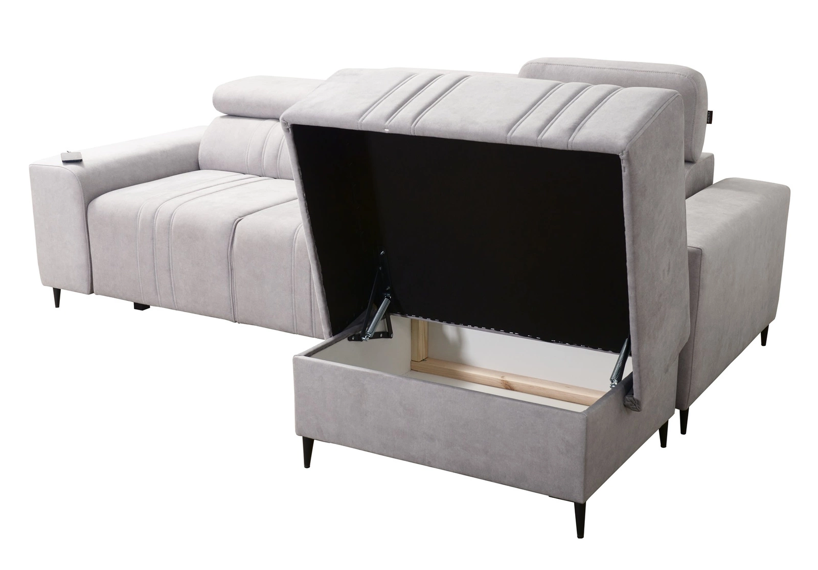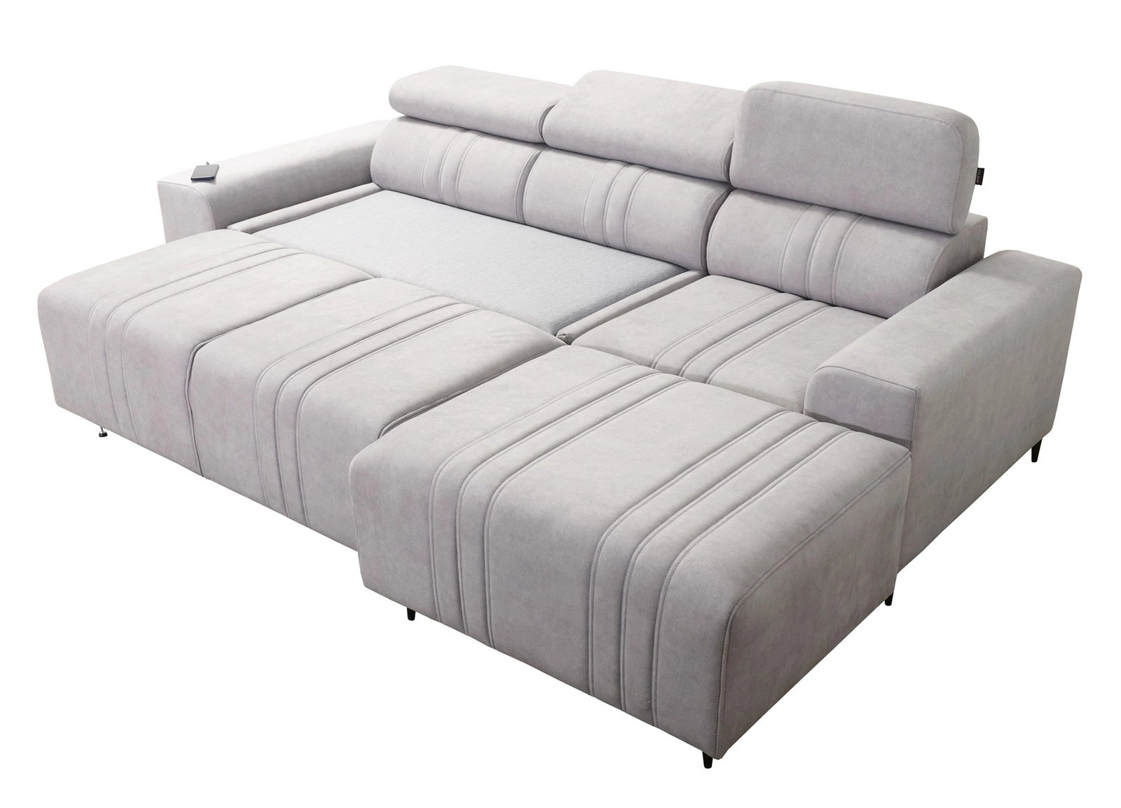 Die Extras dieses Möbels, die alle Benutzer schätzen werden, sind der Bettzeugbehälter, die verstellbaren Kopfstützen und die USB-Ladebuchse an der Seite des Eckmöbels.