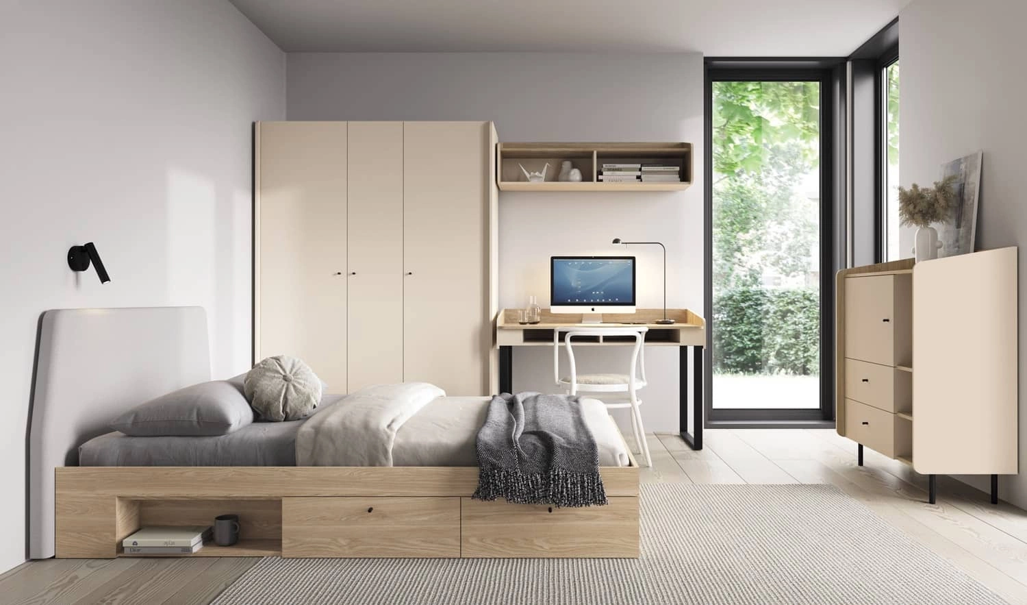 Das Bett Olivio 120x200 cm mit Schubladen aus geölter Eiche ist ein Rezept für eine moderne und funktionelle Einrichtung eines Jugendzimmers.