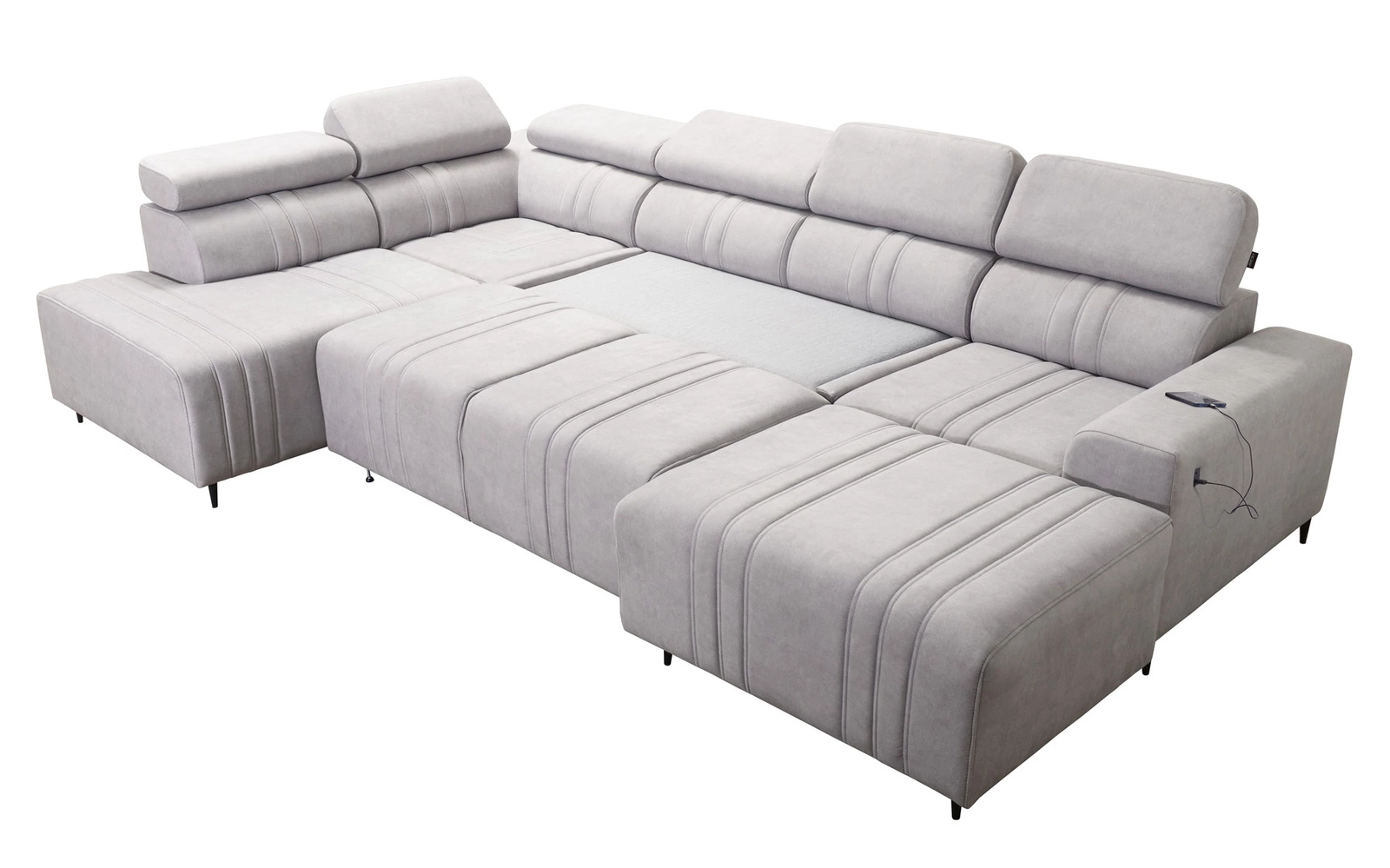 Die Extras dieses Möbels, die alle Benutzer schätzen werden, sind die zwei Bettkästen, die verstellbaren Kopfstützen und die USB-Ladebuchse an der Seite des Eckmöbels.