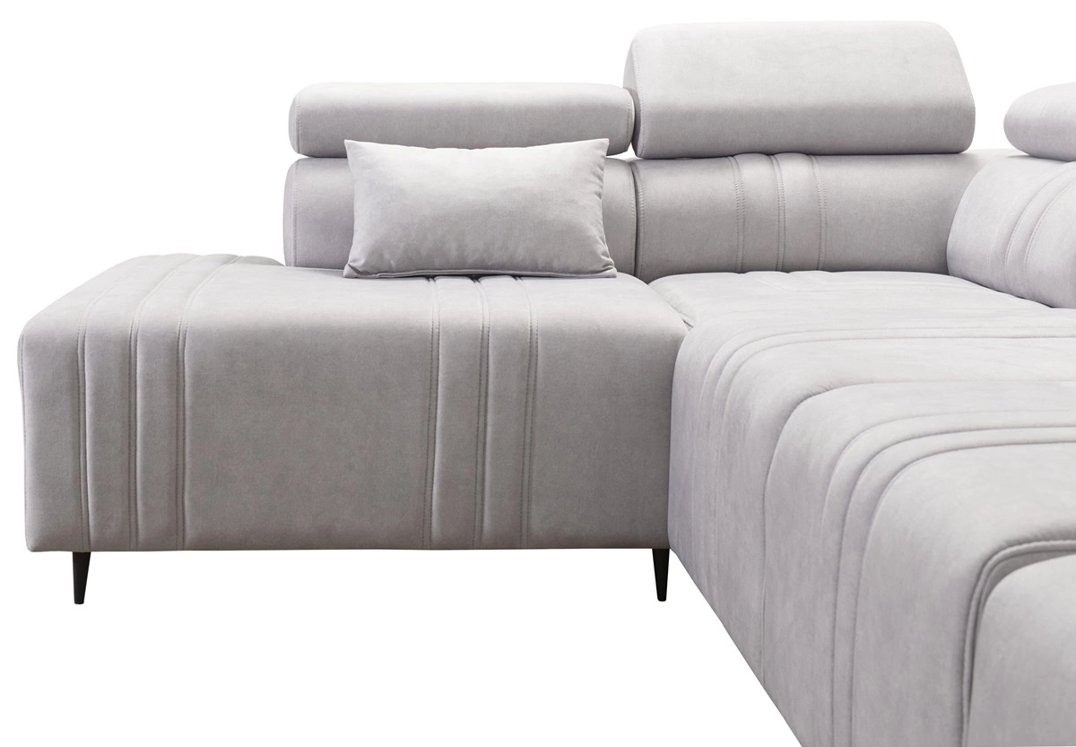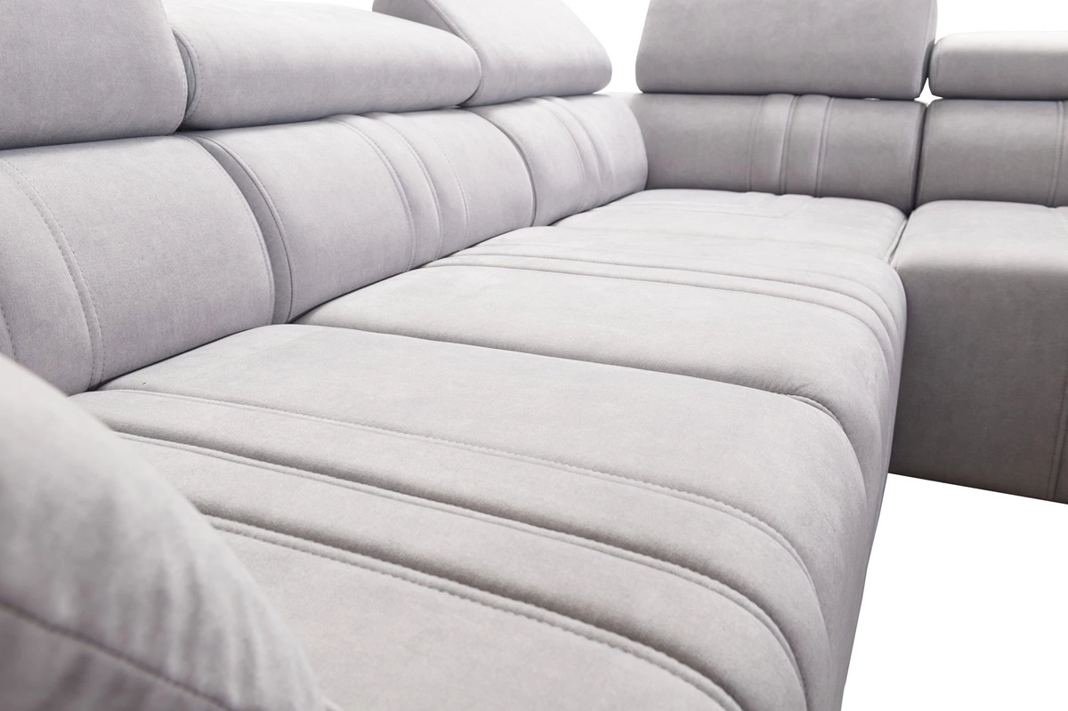 Die Abmessungen der Möbel ermöglichen füllung eines geräumigen Wohnzimmers oder Sitzungssaals. Breite der Ecke 340 cm, maximale Höhe 100 cm und Tiefe 211 cm. Die Liegefläche der Eckeinheit beträgt 132x268 cm. Die Sitzhöhe des Möbels beträgt 49 cm und die maximale Höhe der Rückenlehne beträgt 54 cm. Gewellte Federn und T30-Polyurethanschaum ist das Material, aus dem der Sitz der Ecke hergestellt ist. Feste Rückenlehne mit verstellbaren Kopfstützen ermöglicht eine einfache anpassung sie können die Neigung der Kopfstützen nach Ihren Wünschen einstellen und so für eine bequeme Erholung nach einem langen Tag sorgen, die Sie, Ihre Lieben und auch Ihre Gäste, die auf diesem einzigartigen Ecksofa Platz nehmen, zu schätzen wissen werden.