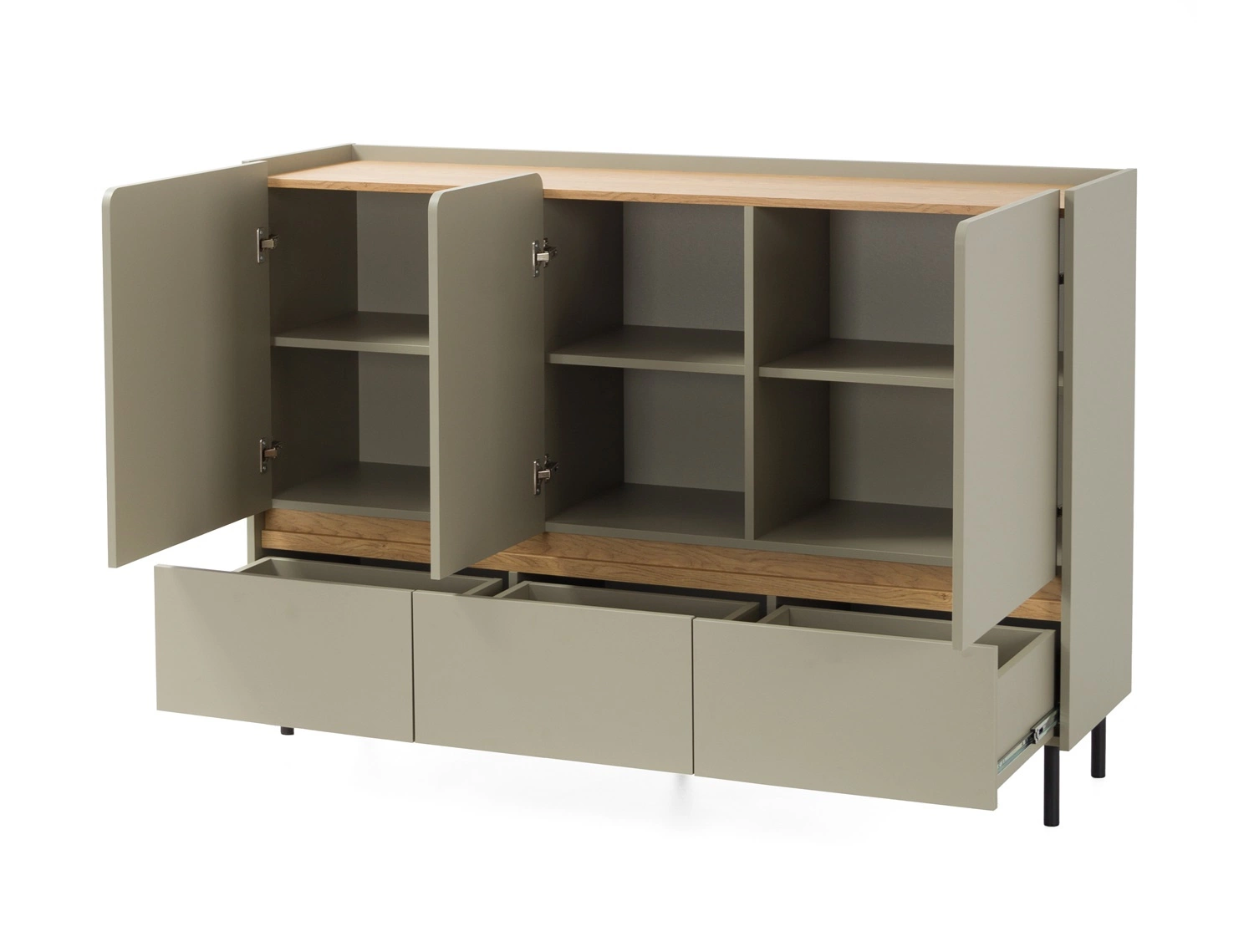 Die Kommode aus der Kollektion Paguro besteht aus 3 Türen, 3 schubladen auszug auf Rollenschlitten. Geräumige Schubladen und abschließbare Schränke bietet Platz für alle notwendigen Zubehörteile und Accessoires. Die Kommode ist hergestellt aus laminierter Platte von hoher Qualität, die resistent gegen äußere Einflüsse wie Druckstellen, Stöße und unglückliche Kratzer ist. Die Struktur der Möbel wurde variiert mit schwarzen Beinen, die die Stabilität des Ganzen garantieren.