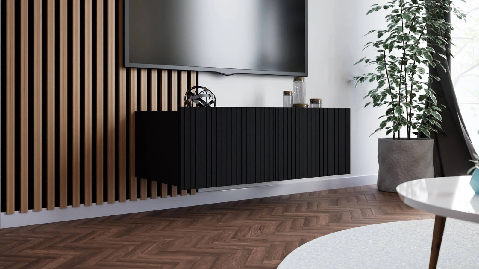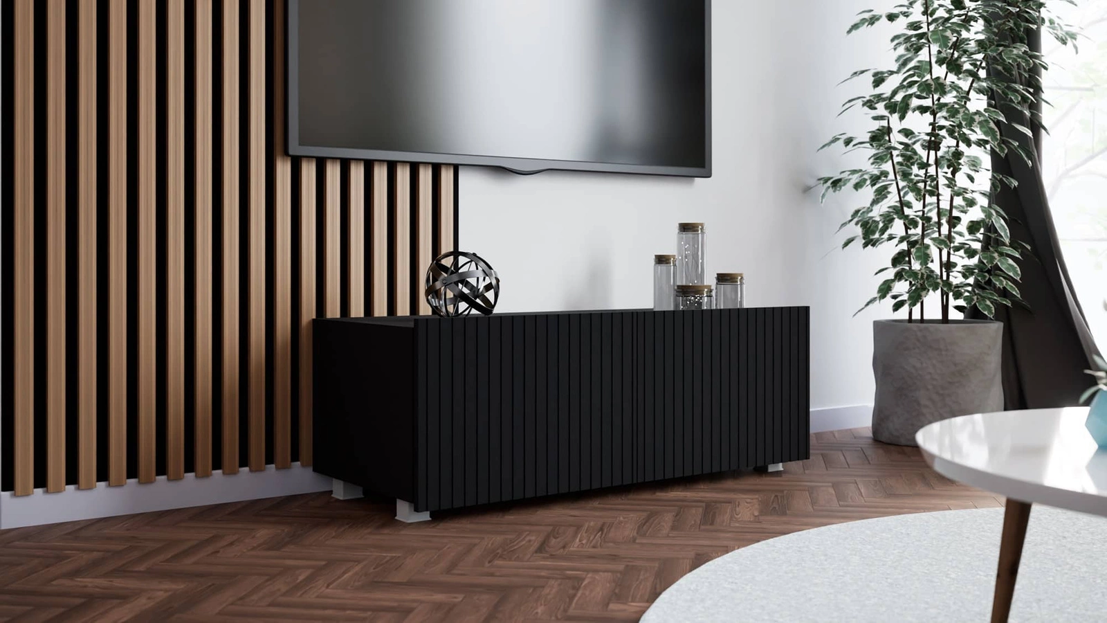 RTV Schrank Colder 100 cm schwarz mit Möglichkeit der Aufhängung stilvolle geriffelte Front elegante Form der Möbel in einem modernen Stil