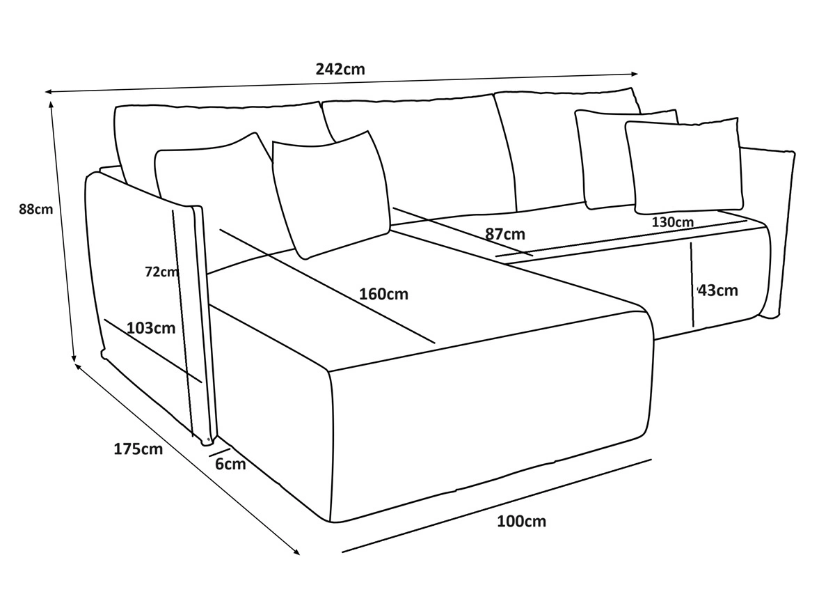 Das Ecksofa mit Schlaffunktion eignet sich dank seiner Abmessungen und seiner breiten Funktionalität ideal als Ecksofa für das Wohnzimmer oder als klappbares Ecksofa für das Gästezimmer. Ein Ecksofa mit Schlaffunktion ist auch eine gute Alternative zu einem Bett im Zimmer der jugendzimmer. Breite der Ecke 242 cm, höhe 88 cm und Tiefe 175 cm. Die Liegefläche des Eckschrankes beträgt 146x230 cm. Die Sitzhöhe des Möbels beträgt 43 cm, und die Höhe der Rückenlehne beträgt 45 cm. Gewellte Federn und T30-Polyurethanschaum ist das Material, aus dem der Sitz der Ecke hergestellt ist. Weich rückenlehnen-Kissen gewährleisten einen hohen Komfort bei der täglichen Erholung, den Sie und Ihre Gäste, die auf diesem einzigartigen Ecksofa sitzen, zu schätzen wissen werden.