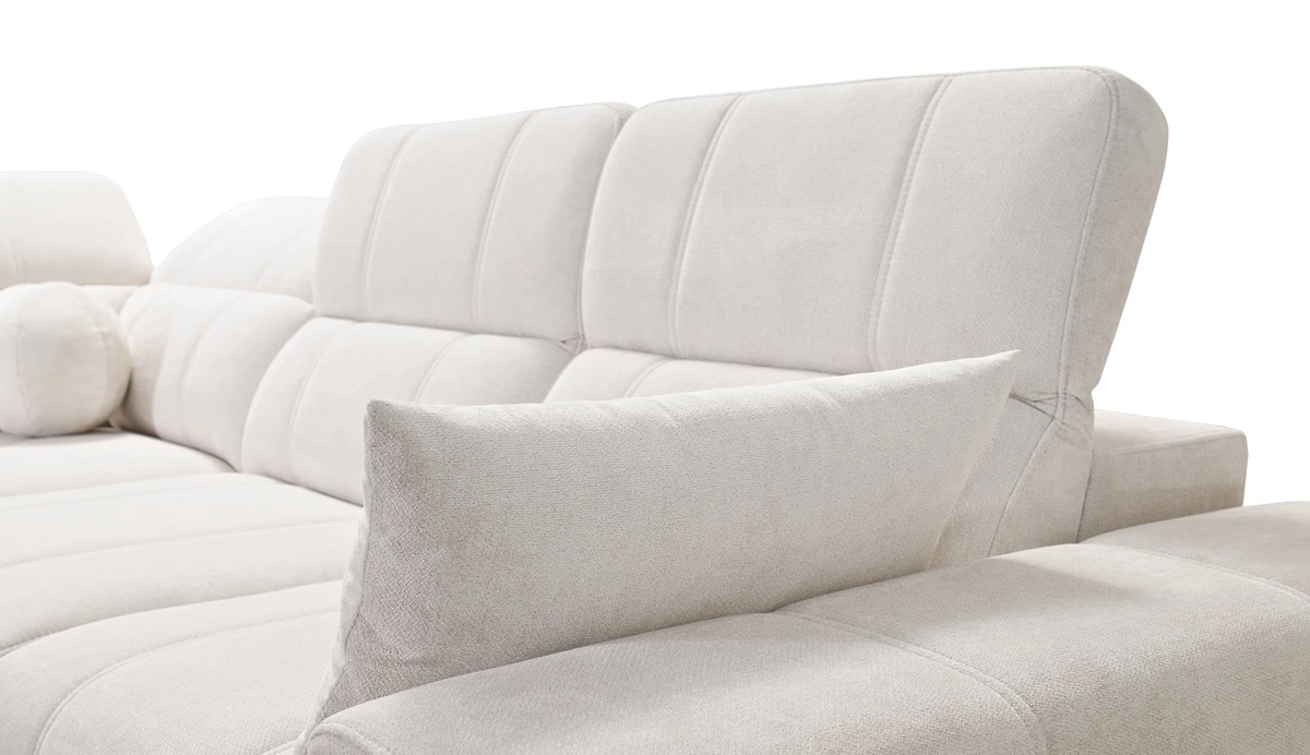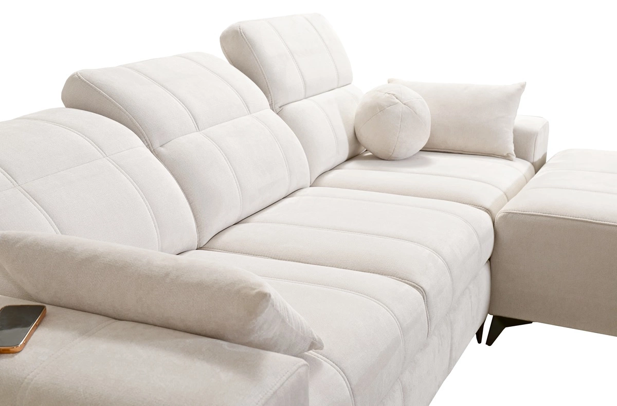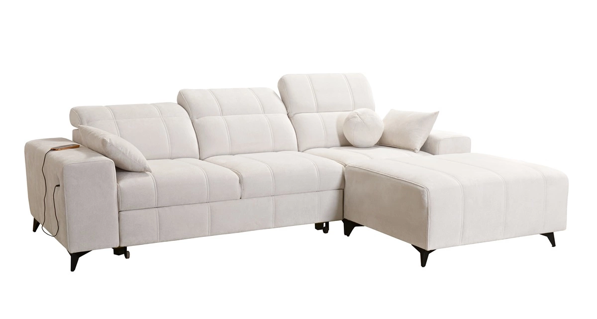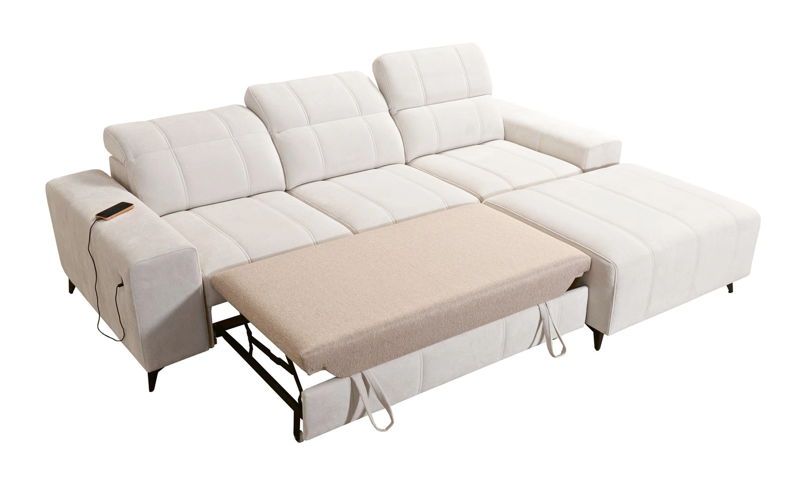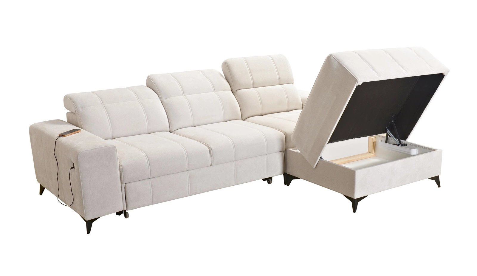 Die Extras dieses Möbels, die alle Nutzer schätzen werden, sind der Bettzeugbehälter, die Schlaffunktion und die USB-Ladebuchse an der Seite des Eckmöbels.