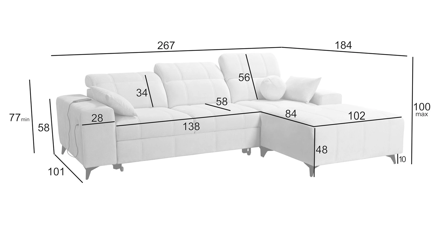 Abmessungen der Möbel ermöglichen füllung eines geräumigen Wohnzimmers oder Sitzungssaals. Breite der Ecke 267 cm, maximale Höhe 100 cm und Tiefe 184 cm. Die Liegefläche der Eckeinheit beträgt 129x209 cm. Die Sitzhöhe des Möbels beträgt 48 cm und die maximale Höhe der Rückenlehne beträgt 56 cm. Gewellte Federn und T30-Polyurethanschaum ist das Material, aus dem der Sitz der Ecke hergestellt ist. Feste Rückenlehne mit verstellbaren Kopfstützen ermöglicht eine einfache anpassung sie können die Neigung der Kopfstützen nach Ihren Wünschen einstellen und so für eine bequeme Erholung nach einem langen Tag sorgen, die Sie, Ihre Lieben und auch Ihre Gäste, die auf diesem einzigartigen Ecksofa Platz nehmen, zu schätzen wissen werden.