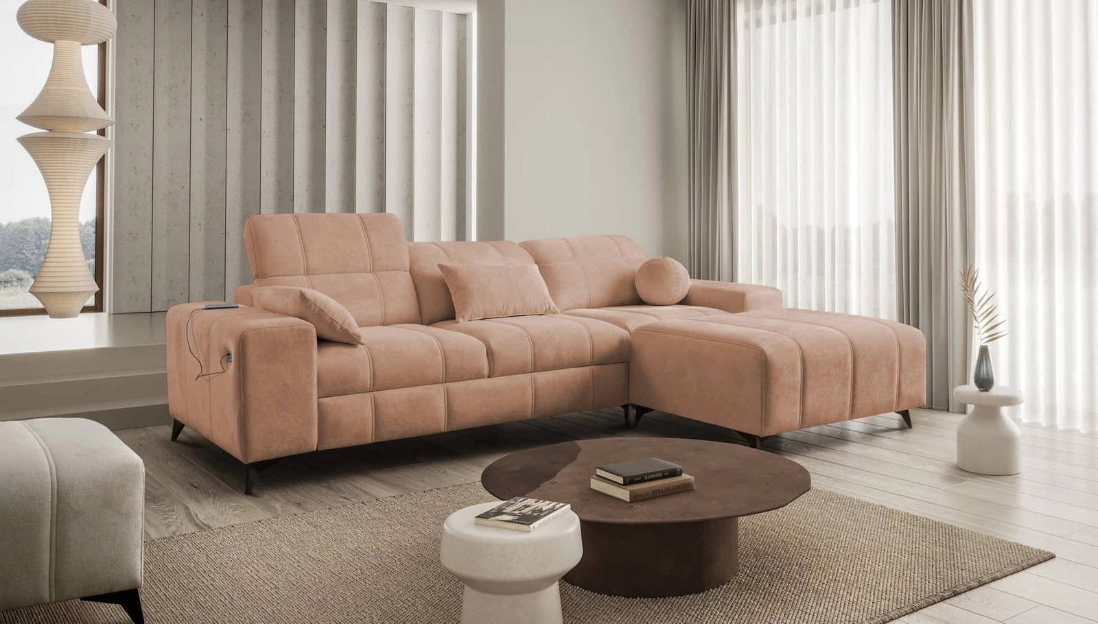 Ecksofa Penejos in lachsfarben mit verstellbaren Kopfstützen ist ein herrliches Möbelstück mit der Garantie für höchsten Komfort und Funktionalität.