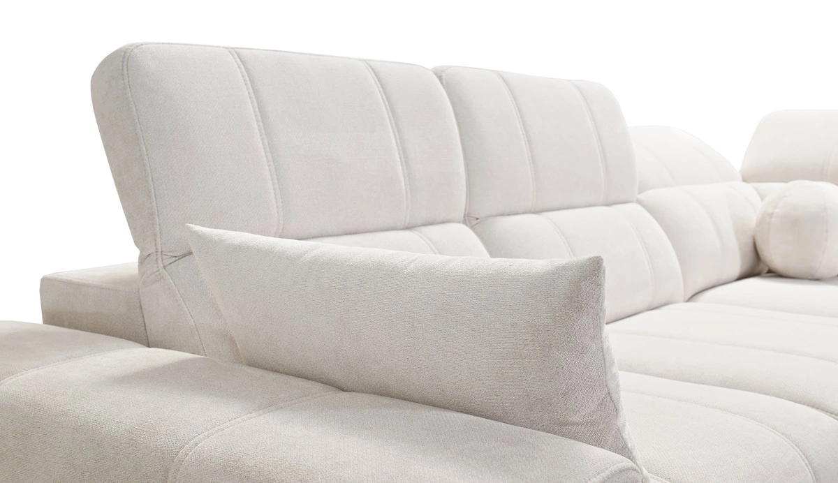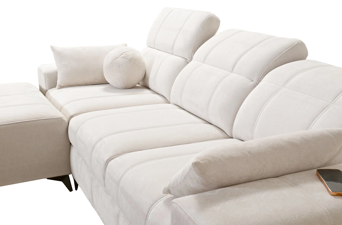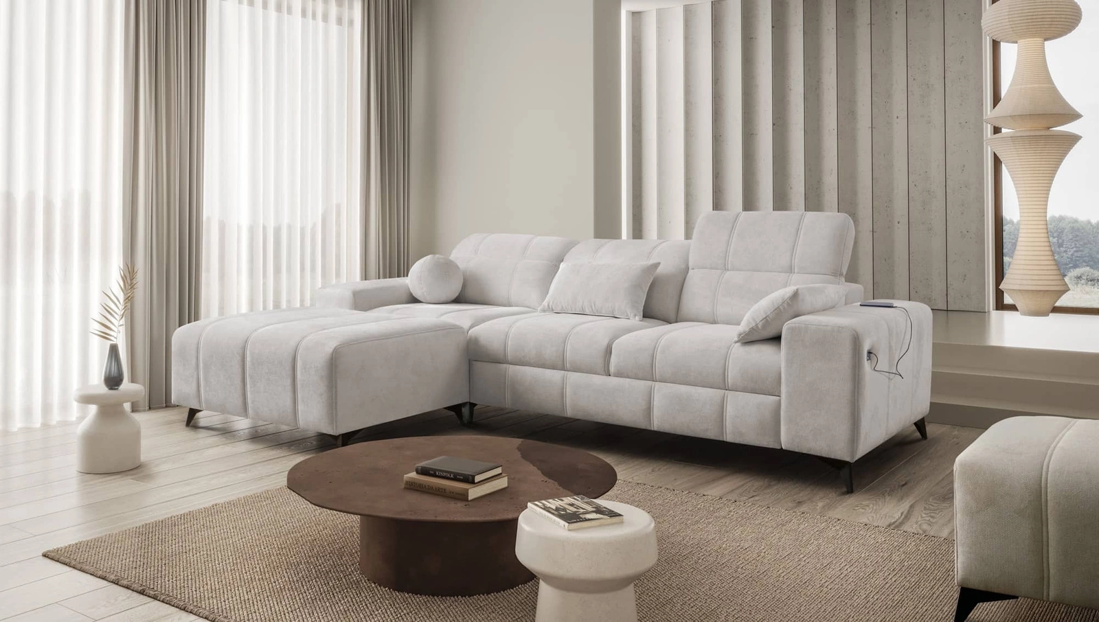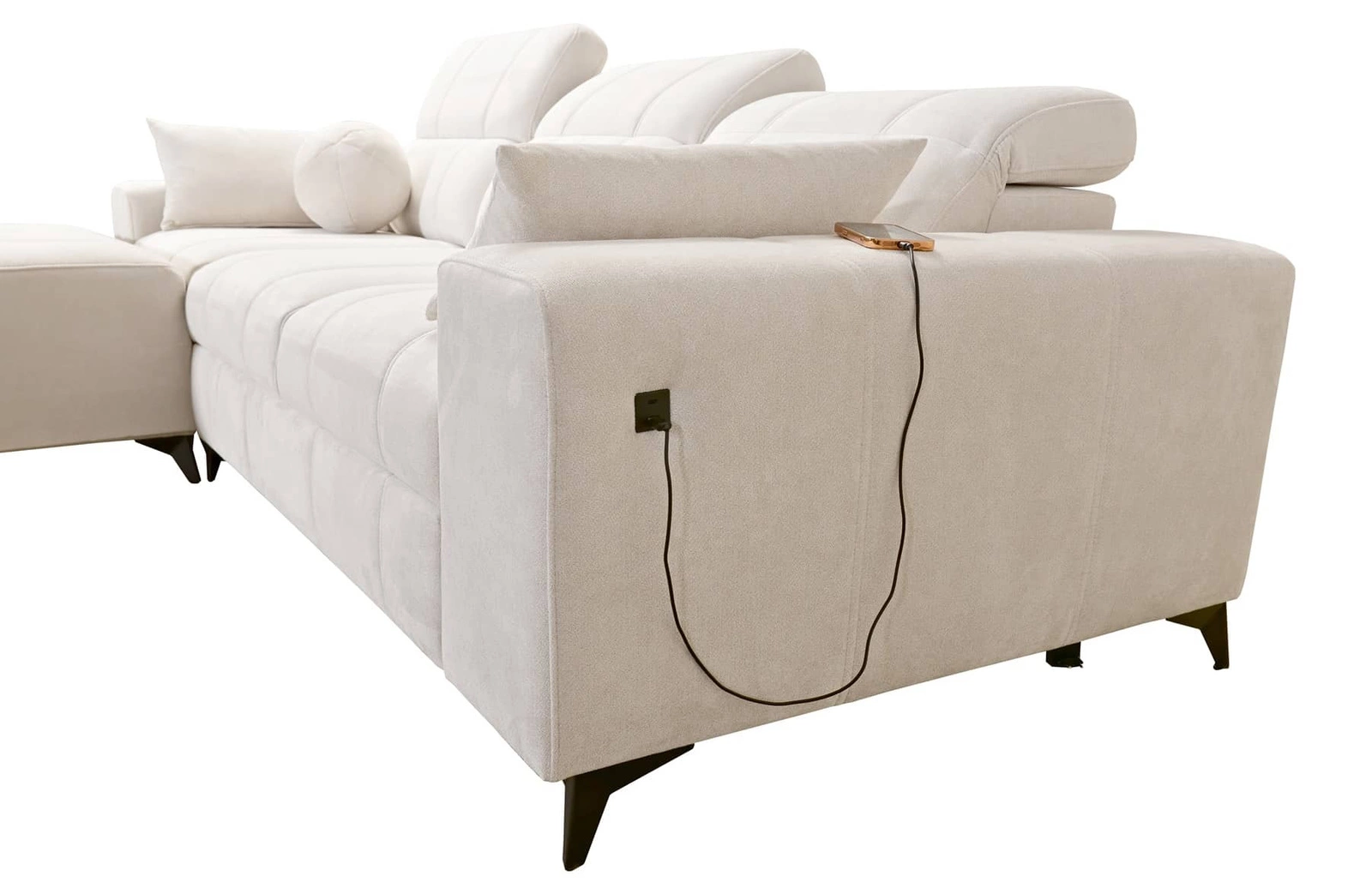 Die Extras dieses Möbels, die alle Nutzer schätzen werden, sind der Bettzeugbehälter, die Schlaffunktion und die USB-Ladebuchse an der Seite des Eckmöbels.