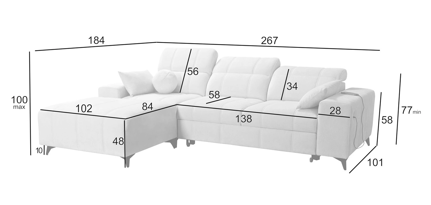 Abmessungen der Möbel ermöglichen füllung eines geräumigen Wohnzimmers oder Sitzungssaals. Breite der Ecke 267 cm, maximale Höhe 100 cm und Tiefe 184 cm. Die Liegefläche der Eckeinheit beträgt 129x209 cm. Die Sitzhöhe des Möbels beträgt 48 cm und die maximale Höhe der Rückenlehne beträgt 56 cm. Gewellte Federn und T30-Polyurethanschaum ist das Material, aus dem der Sitz der Ecke hergestellt ist. Feste Rückenlehne mit verstellbaren Kopfstützen ermöglicht eine einfache anpassung sie können die Neigung der Kopfstützen nach Ihren Wünschen einstellen und so für eine bequeme Erholung nach einem langen Tag sorgen, die Sie, Ihre Lieben und auch Ihre Gäste, die auf diesem einzigartigen Ecksofa Platz nehmen, zu schätzen wissen werden.