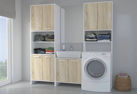 Die Badezimmerschränke der Kollektion Mela füllen den Raum in jedem Badezimmer perfekt aus. Modische Farben und die glatte Oberfläche der Fronten sorgt für ein ästhetisches Erscheinungsbild und bringt Wärme in das Badezimmer. Einfach entwurf dadurch eignet sich der Badezimmerschrank über der Waschmaschine sowohl für Bäder mit minimalistischer Ausstattung als auch für Bäder mit modernem Design. Ungewöhnlicher Abschluss der Schrankfronten sind die breiten silberfarbenen Griffe.