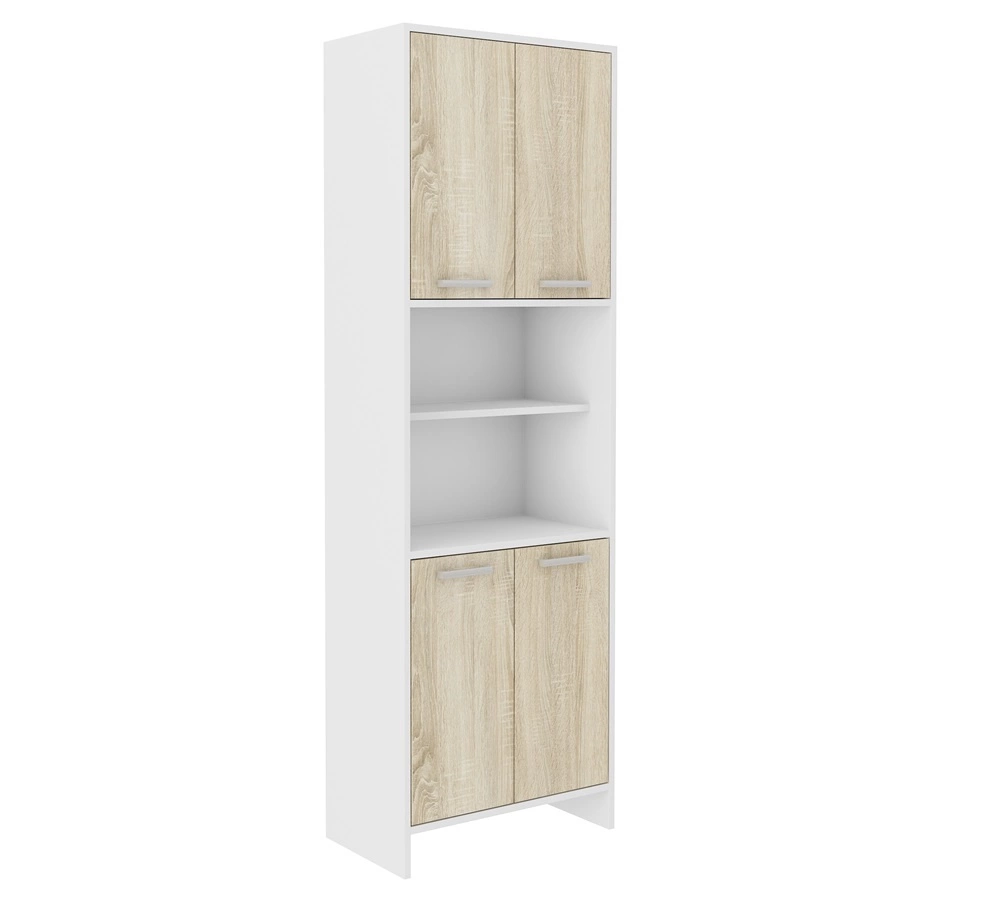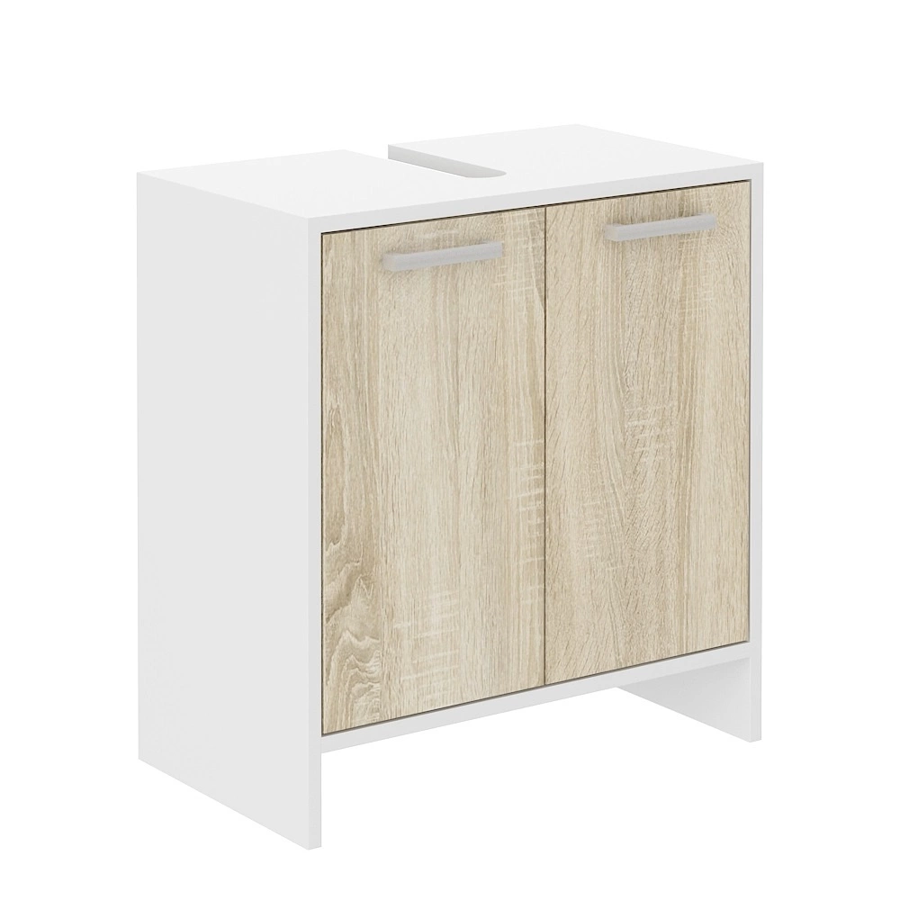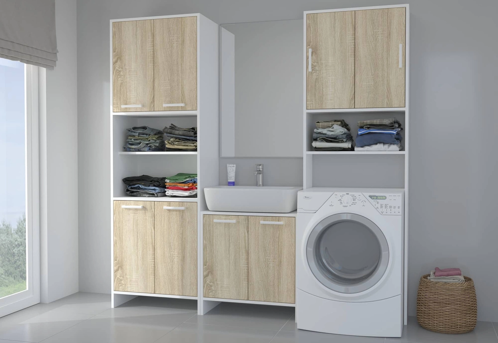 Das Badmöbelset Mela in Weiß/Eiche Sonoma ist ein Rezept für eine moderne und funktionale Ausstattung jeder Einrichtung.