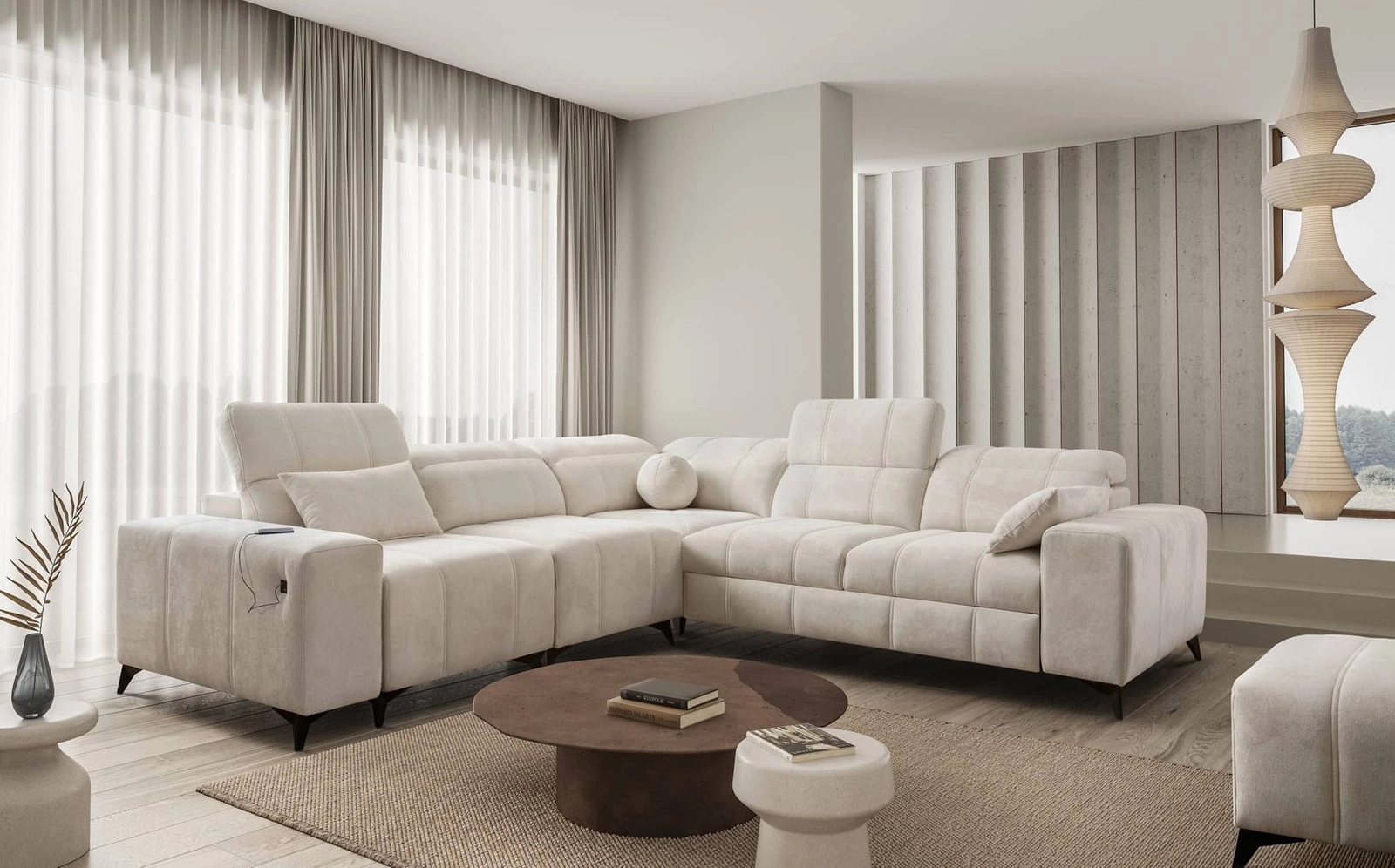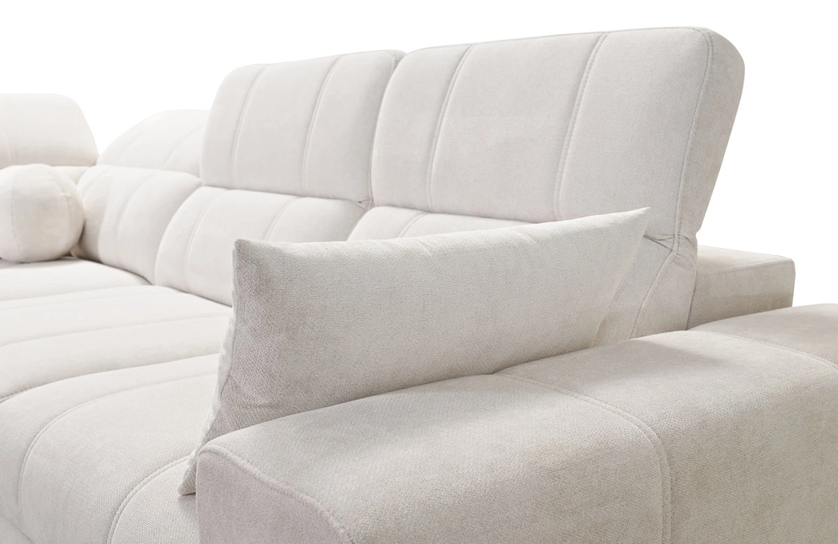 Ecksofa Penejos III in Creme mit verstellbaren Kopfstützen ist ein reizvolles Möbelstück mit der Garantie für höchsten Komfort und Funktionalität.