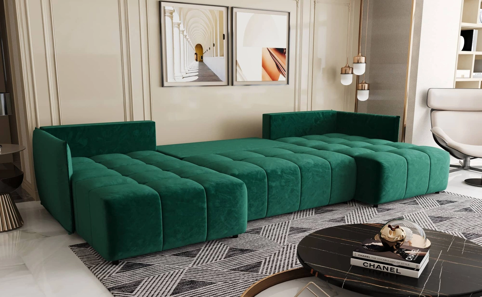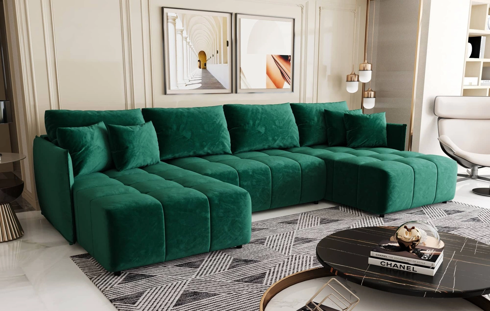 - Das Ecksofa Oroso U mit Schlaffunktion ist ein interessantes Möbelstück, das sich perfekt in die aktuellen Einrichtungstrends einfügt. Ecksofa aus weichem Samtstoff mit einer interessanten Struktur, die dem Sofa einen besonderen Charakter verleiht.