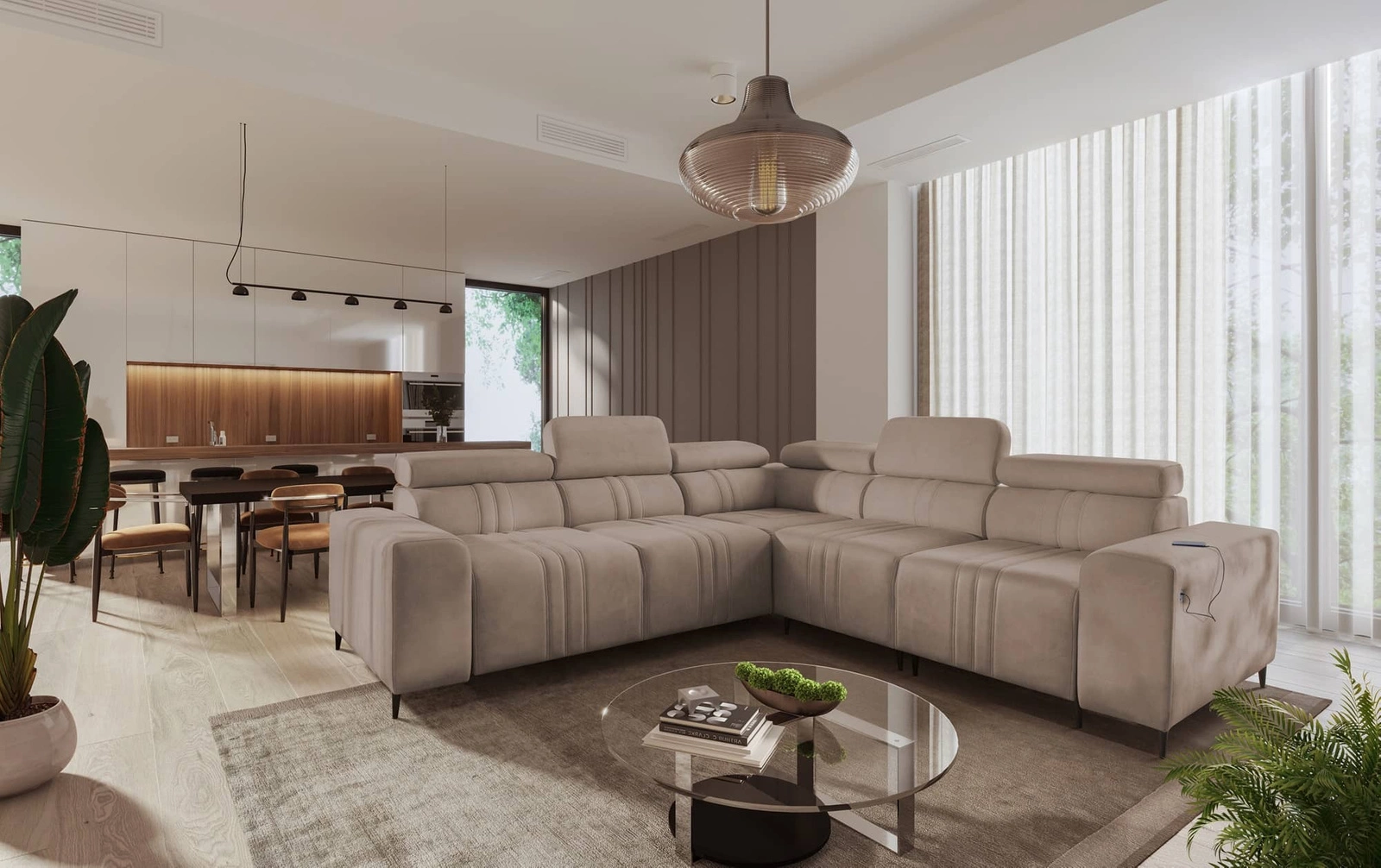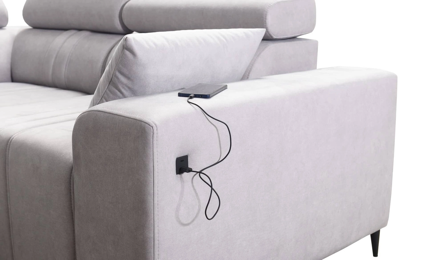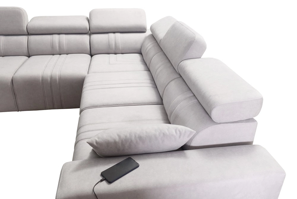 Die Extras dieses Möbels, die alle Benutzer schätzen werden, sind die zwei Bettkästen, die verstellbaren Kopfstützen und die USB-Ladebuchse an der Seite des Eckmöbels.