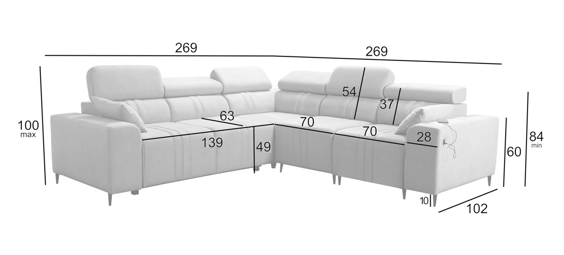 Die Abmessungen der Möbel ermöglichen füllung eines geräumigen Wohnzimmers oder Sitzungssaals. Breite der Ecke 269 cm, maximale Höhe 100 cm und Tiefe 269 cm. Die Liegefläche des Eckschrankes beträgt 132x207 cm. Die Sitzhöhe des Möbels beträgt 49 cm und die maximale Höhe der Rückenlehne beträgt 54 cm. Gewellte Federn und T30-Polyurethanschaum ist das Material, aus dem der Sitz der Ecke hergestellt ist. Feste Rückenlehne mit verstellbaren Kopfstützen ermöglicht eine einfache anpassung sie können die Neigung der Kopfstützen nach Ihren Wünschen einstellen und so für eine bequeme Erholung nach einem langen Tag sorgen, die Sie, Ihre Lieben und auch Ihre Gäste, die auf diesem einzigartigen Ecksofa Platz nehmen, zu schätzen wissen werden.