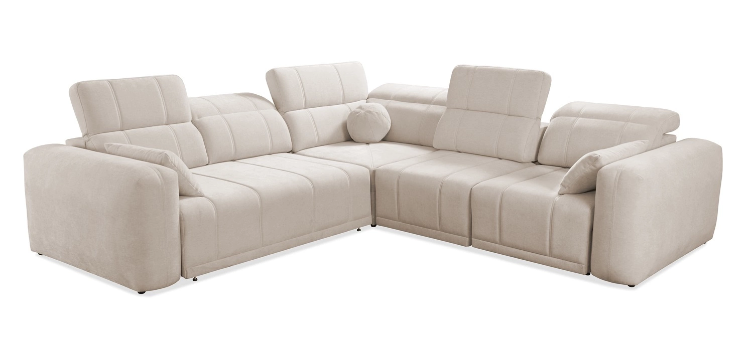 Eckeinheit mit Schlaffunktion Cetara III verbindet Funktionalität mit einer äußerst stilvollen und eleganten Form. Die gesamte ist bedeckt mit stoff geflochtene Ausführung Wind 90. Eckeinheit durch ein interessantes Design, eine Vielzahl von Accessoires in Form von zierkissen, die noch mehr Komfort und Bequemlichkeit für diese hochmoderne Eckeinheit gewährleisten und hohe Verarbeitungsqualität. Das stilvolle Ecksofa ist mit einer innovativen Funktion angereichert verschiebbare Rückenlehne zur Einstellung der Sitztiefe. Modernes eckdesign wird den höchsten Ansprüchen an Funktionalität und Design gerecht.