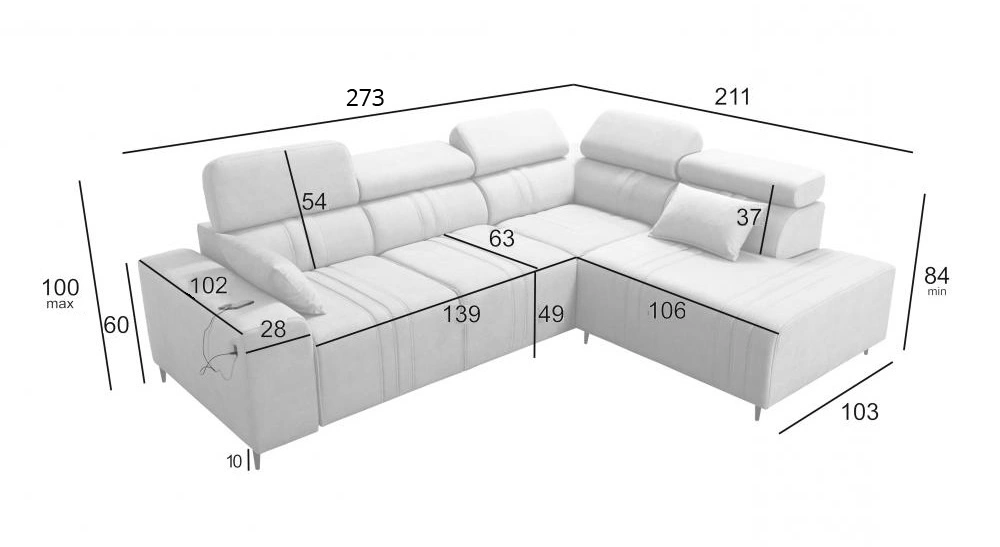 Die Abmessungen der Möbel ermöglichen füllung eines geräumigen Wohnzimmers oder Sitzungssaals. Breite der Ecke 273 cm, maximale Höhe 100 cm und Tiefe 211 cm. Die Liegefläche des Eckschrankes beträgt 132x202 cm. Die Sitzhöhe des Möbels beträgt 49 cm und die maximale Höhe der Rückenlehne beträgt 54 cm. Gewellte Federn und T30-Polyurethanschaum ist das Material, aus dem der Sitz der Ecke hergestellt ist. Feste Rückenlehne mit verstellbaren Kopfstützen ermöglicht eine einfache anpassung sie können die Neigung der Kopfstützen nach Ihren Wünschen einstellen und so für eine bequeme Erholung nach einem langen Tag sorgen, die Sie, Ihre Lieben und auch Ihre Gäste, die auf diesem einzigartigen Ecksofa Platz nehmen, zu schätzen wissen werden.
