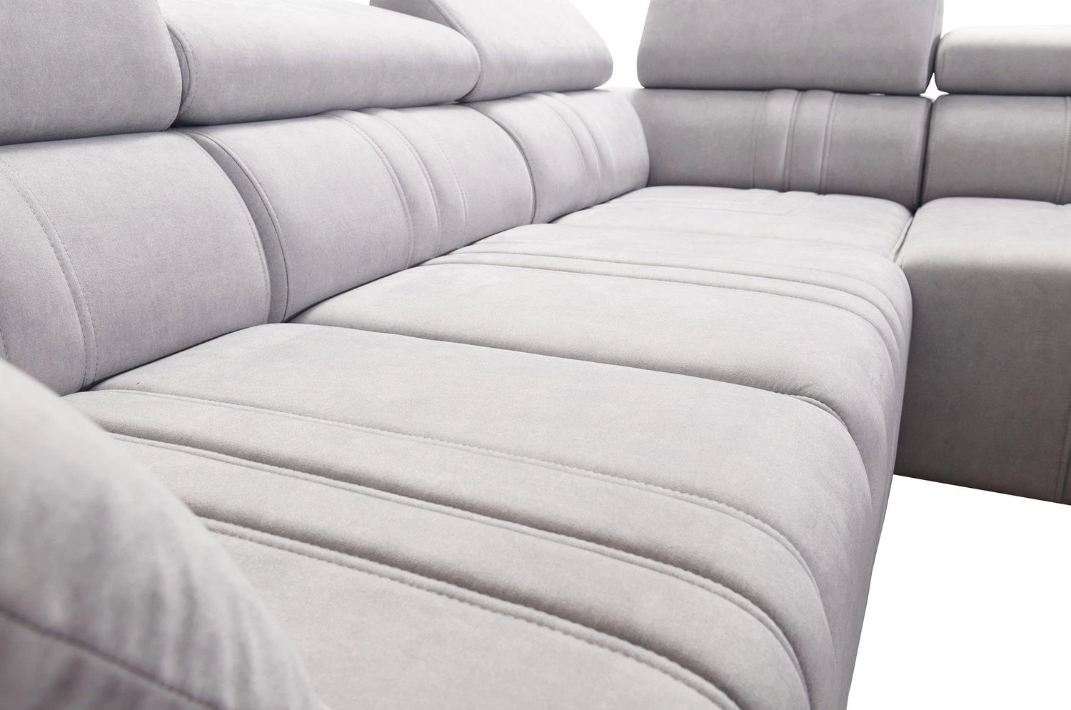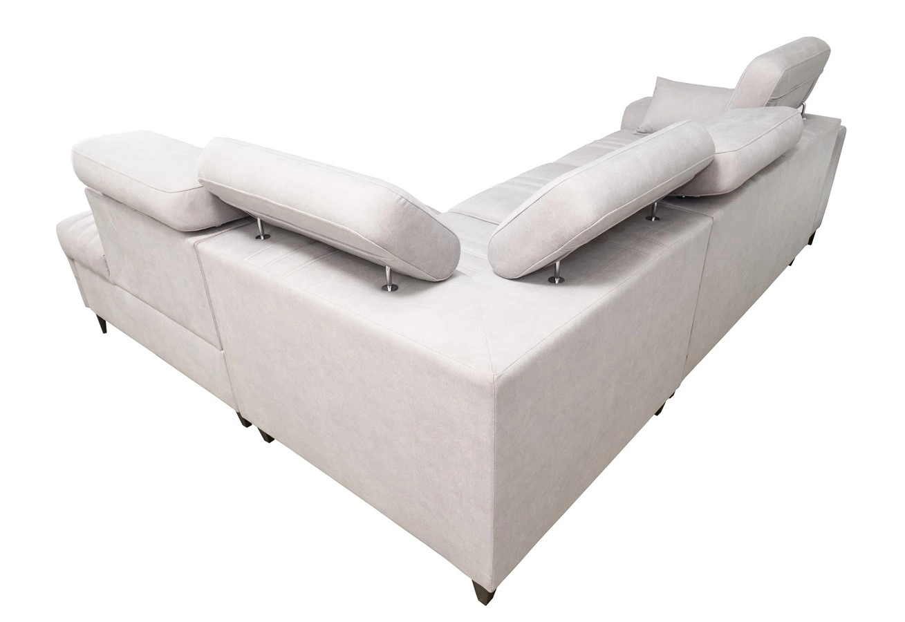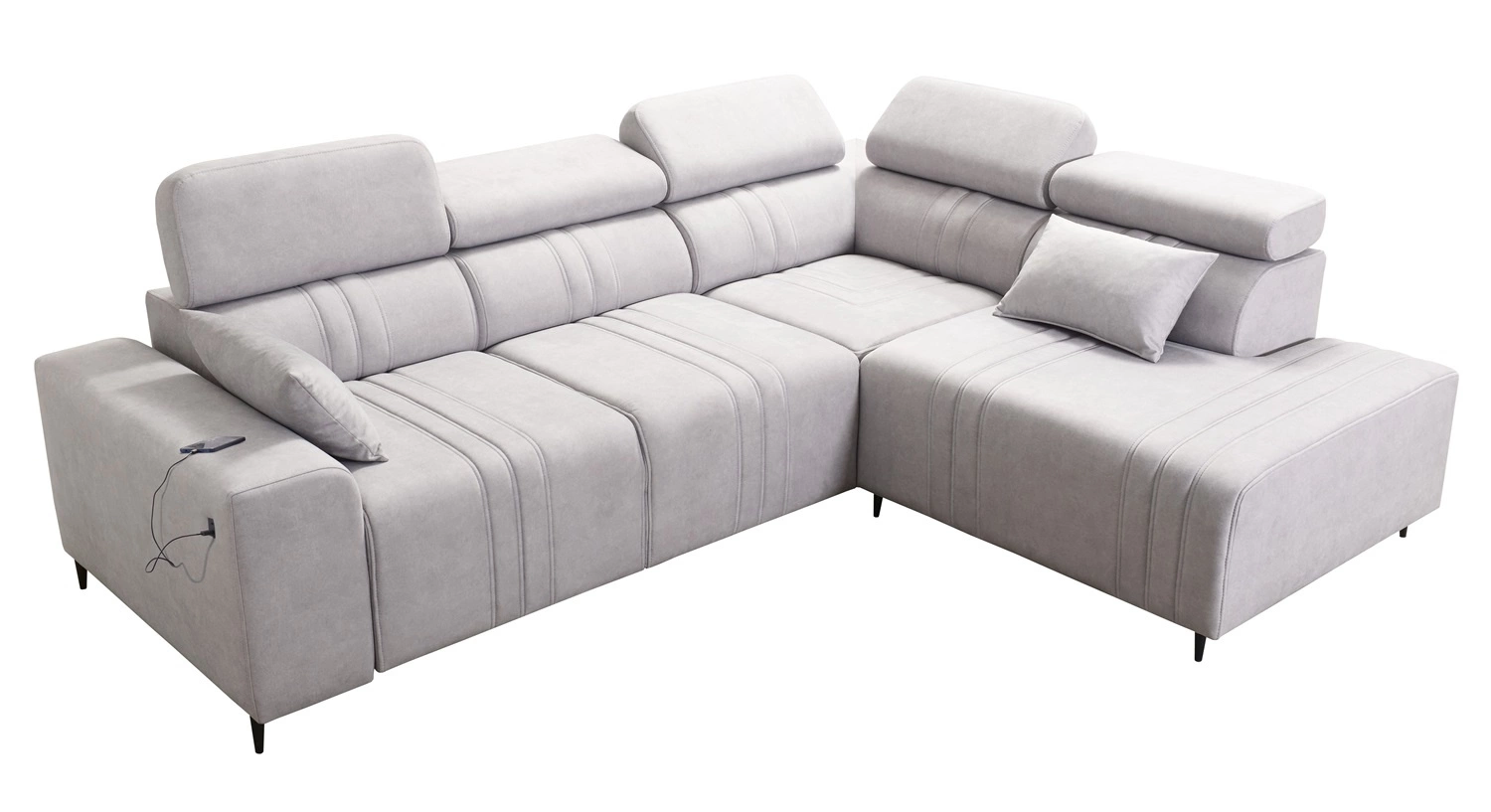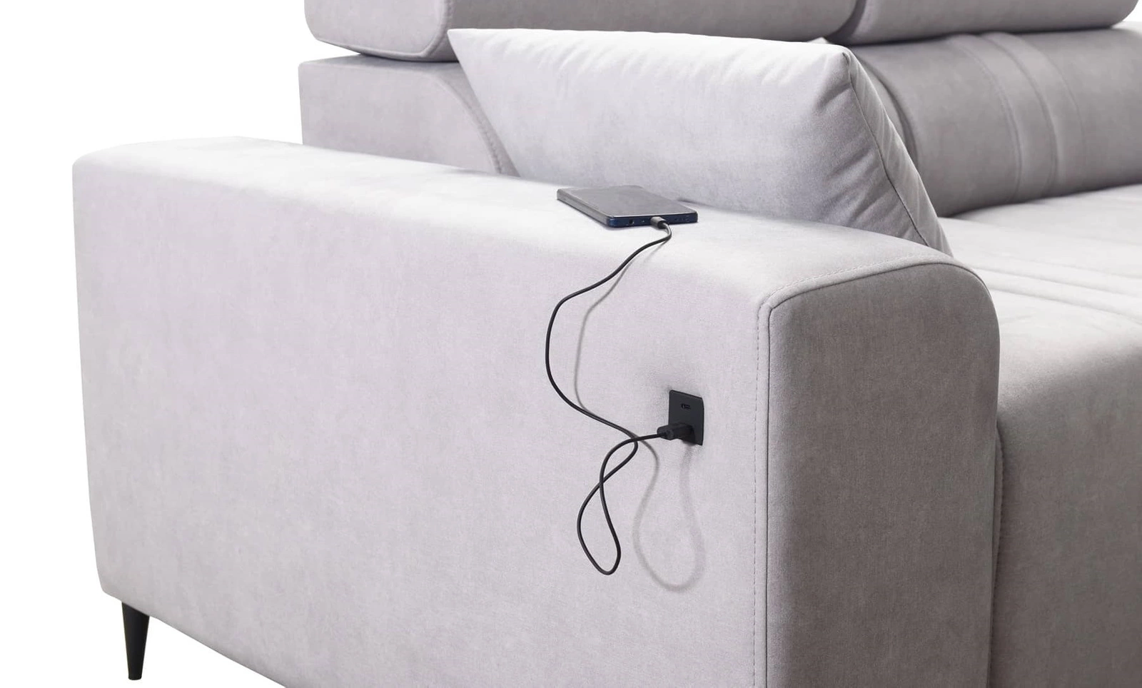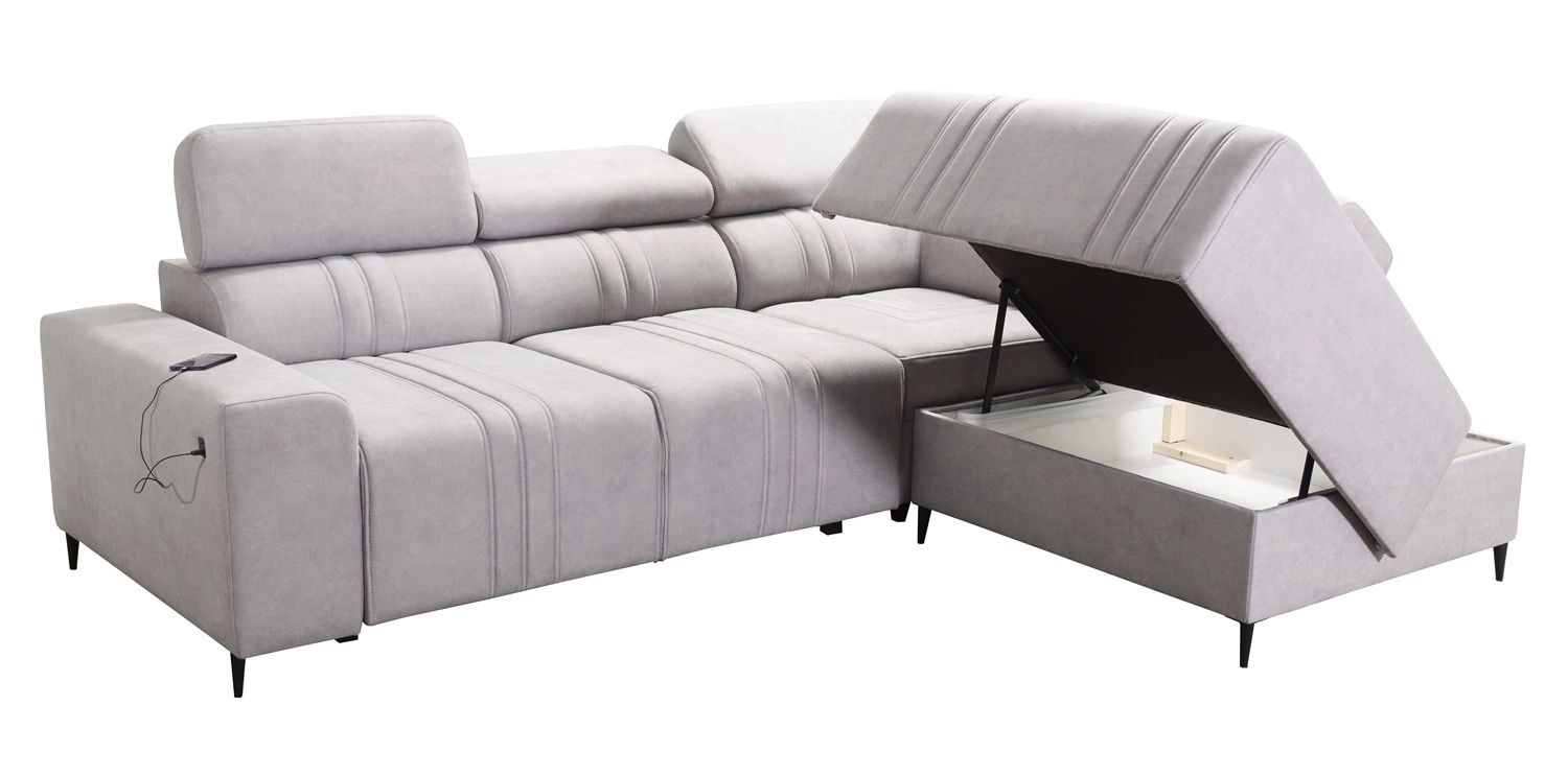 Die Extras dieses Möbels, die alle Benutzer schätzen werden, sind der Bettzeugbehälter, die verstellbaren Kopfstützen und die USB-Ladebuchse an der Seite des Eckmöbels.