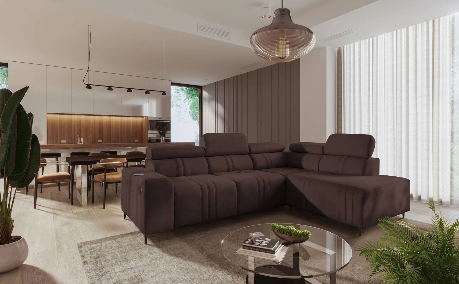 Ecksofa mit Schlaffunktion Castel VII braun rechtsseitig stilvolles Ecksofa mit Bettzeugablage und verstellbaren Kopfstützen